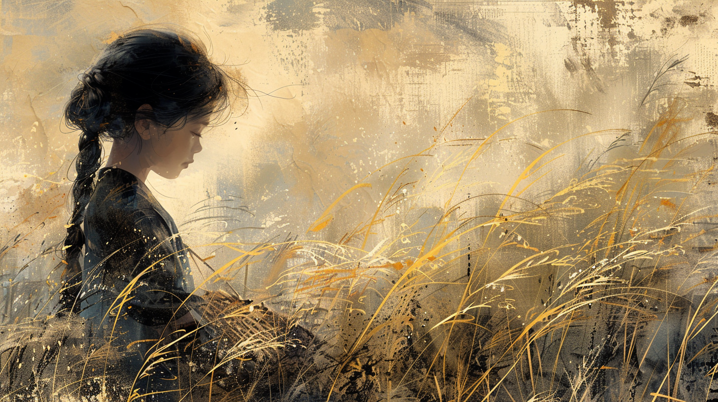 | ⑤ 가을 - 수확 끝난 들판 | 피로 거둔 이삭은 참새에게 날아가고, 아이는 멍하니 앉아 있어요. 허탈한 풍경과 함께 계절이 바뀌고 있어요. |