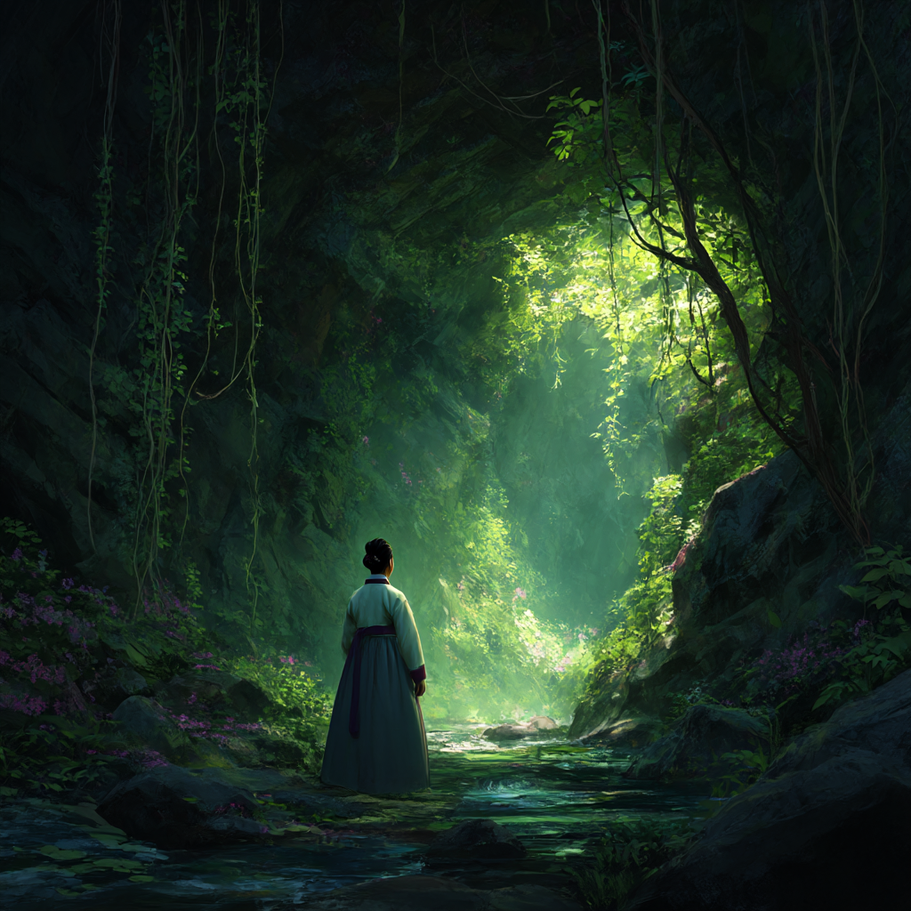 이후 오윤겸은 설생을 따라 회룡굴로 향합니다. 그곳은 험한 돌길과 칡덩굴을 지나야만 도달할 수 있는 별천지입니다. 작품 속 이 공간은 현실과 대비되는 이상향으로 묘사되며, 설생의 은거가 단순한 도피가 아닌 풍요롭고 자족적인 삶임을 상징합니다.