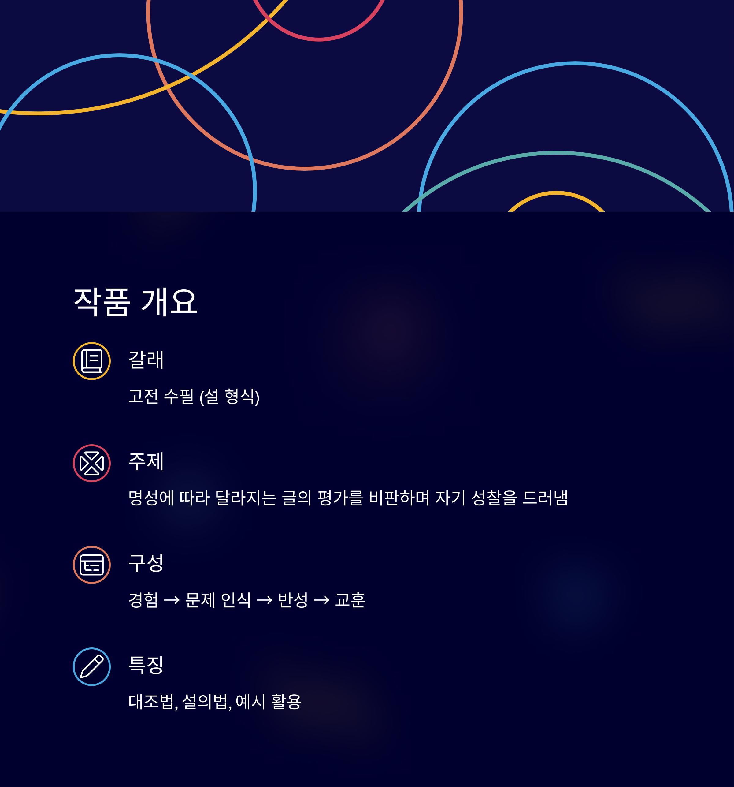 작품의 시대적 배경과 수필이라는 장르의 특성을 안다면, 글의 의도와 작가의 태도를 훨씬 쉽게 이해할 수 있어요.