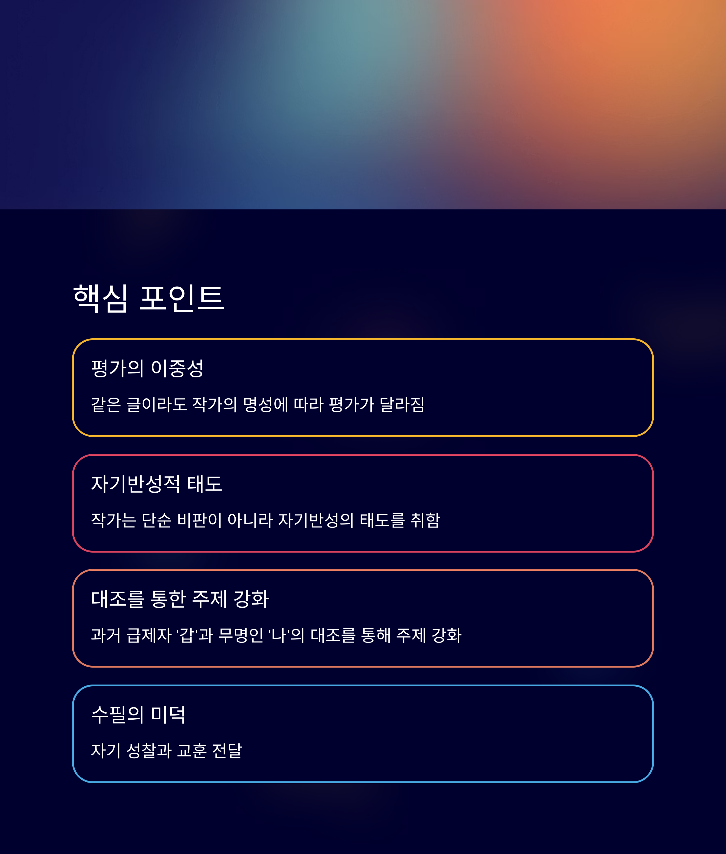 화자는 그 상황을 단순히 비판만 하지 않아요. 자신도 그 안에서 흔들리고 있음을 깨닫고, 부끄러워하며 성찰합니다. 그리고 이 경험을 성장의 계기로 삼으려 하죠. 수필의 미덕인 ‘자기반성’이 잘 드러나 있어요.