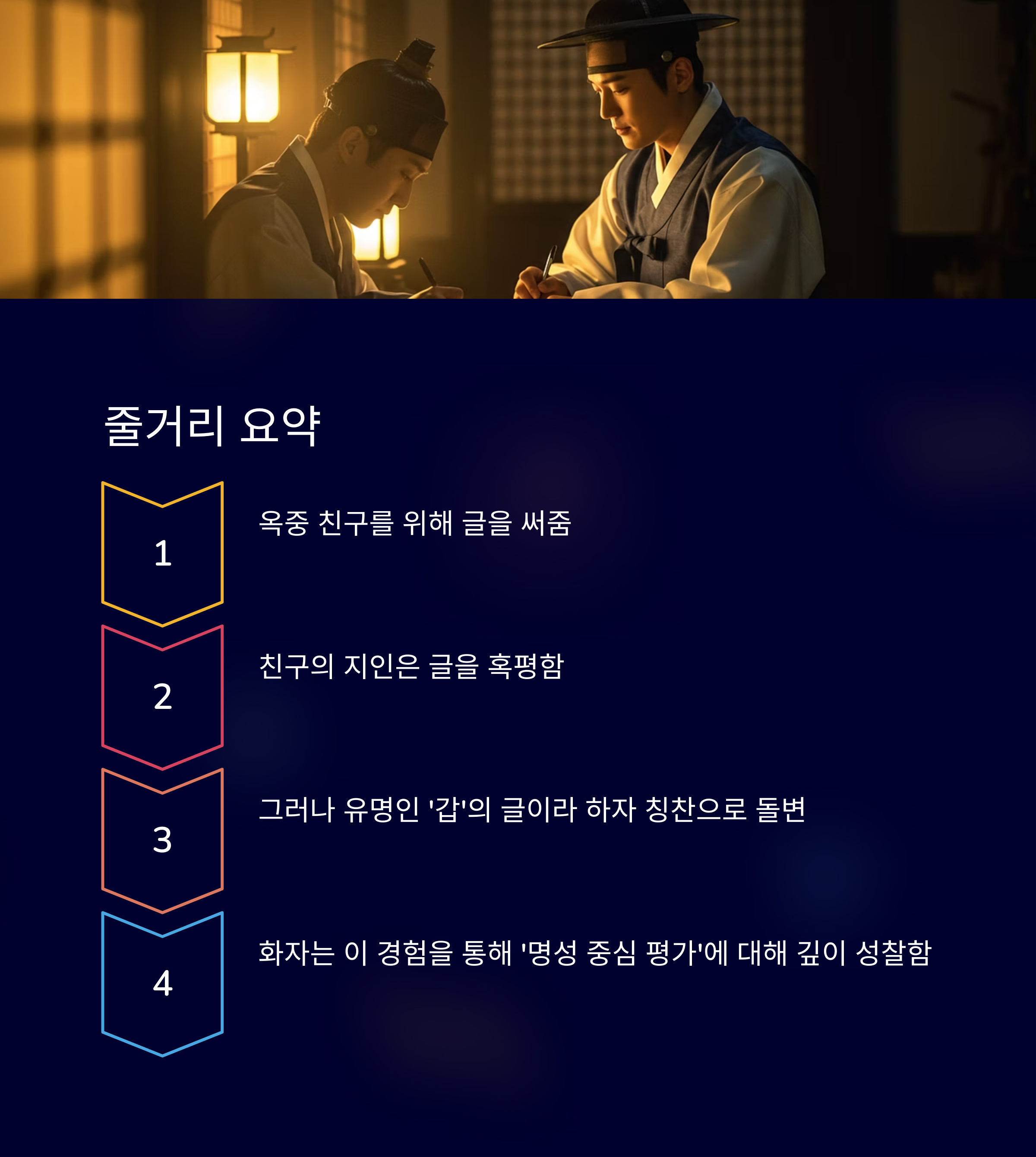 그는 글의 진짜 내용이 아닌, 누가 썼느냐에 따라 평가했기 때문이에요. 처음엔 ‘화자’의 글이라며 무시했지만, 유명한 ‘갑’의 글이라는 말을 듣고 갑자기 태도가 바뀌죠. 이는 명성이 판단 기준이 되는 현실을 보여줘요.