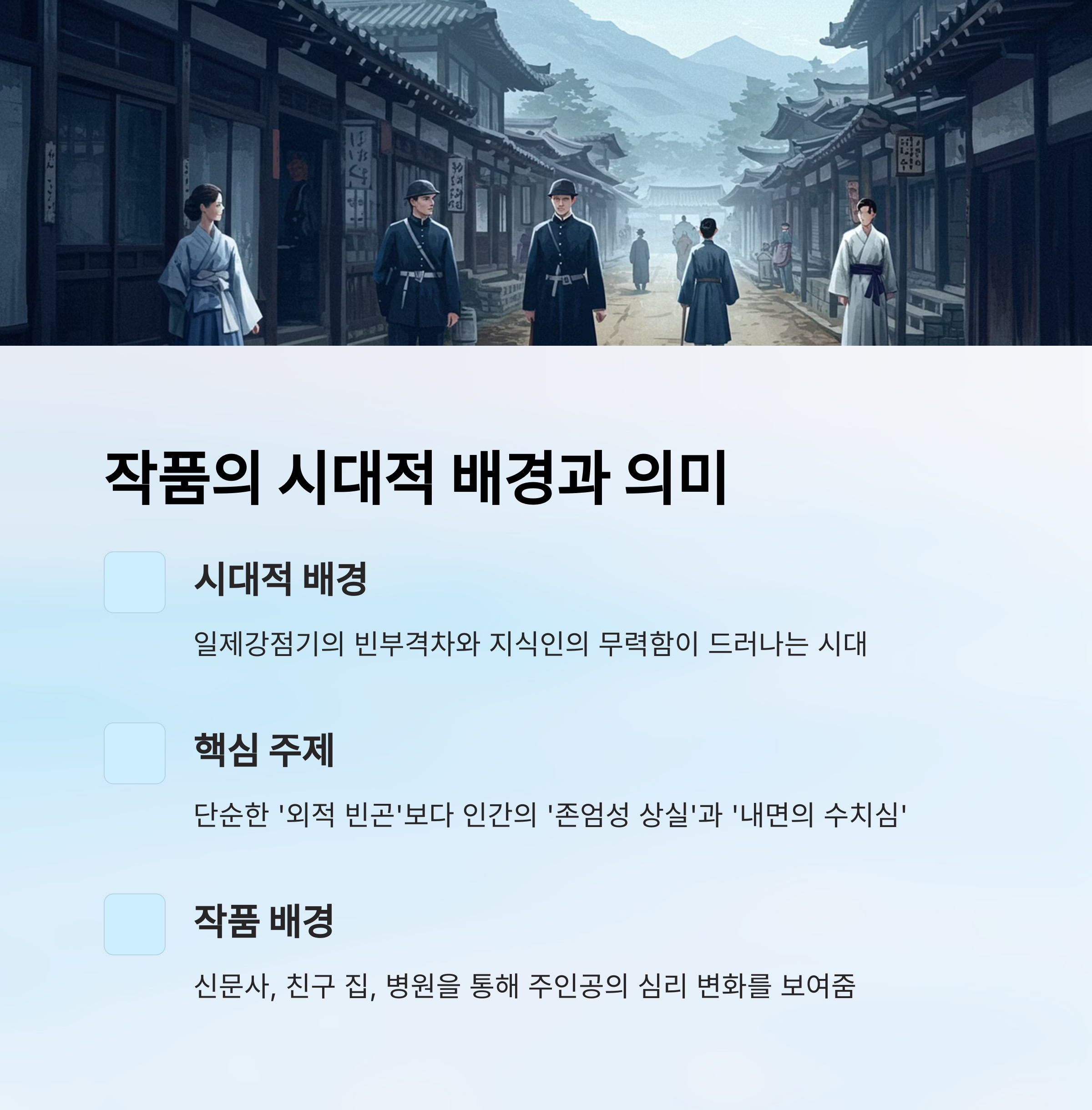 | 일제강점기의 식민 현실 | 춘수가 살아가는 사회는 빈부격차가 심하고, 약자는 끊임없이 '존재를 증명'해야만 했던 시기입니다. |