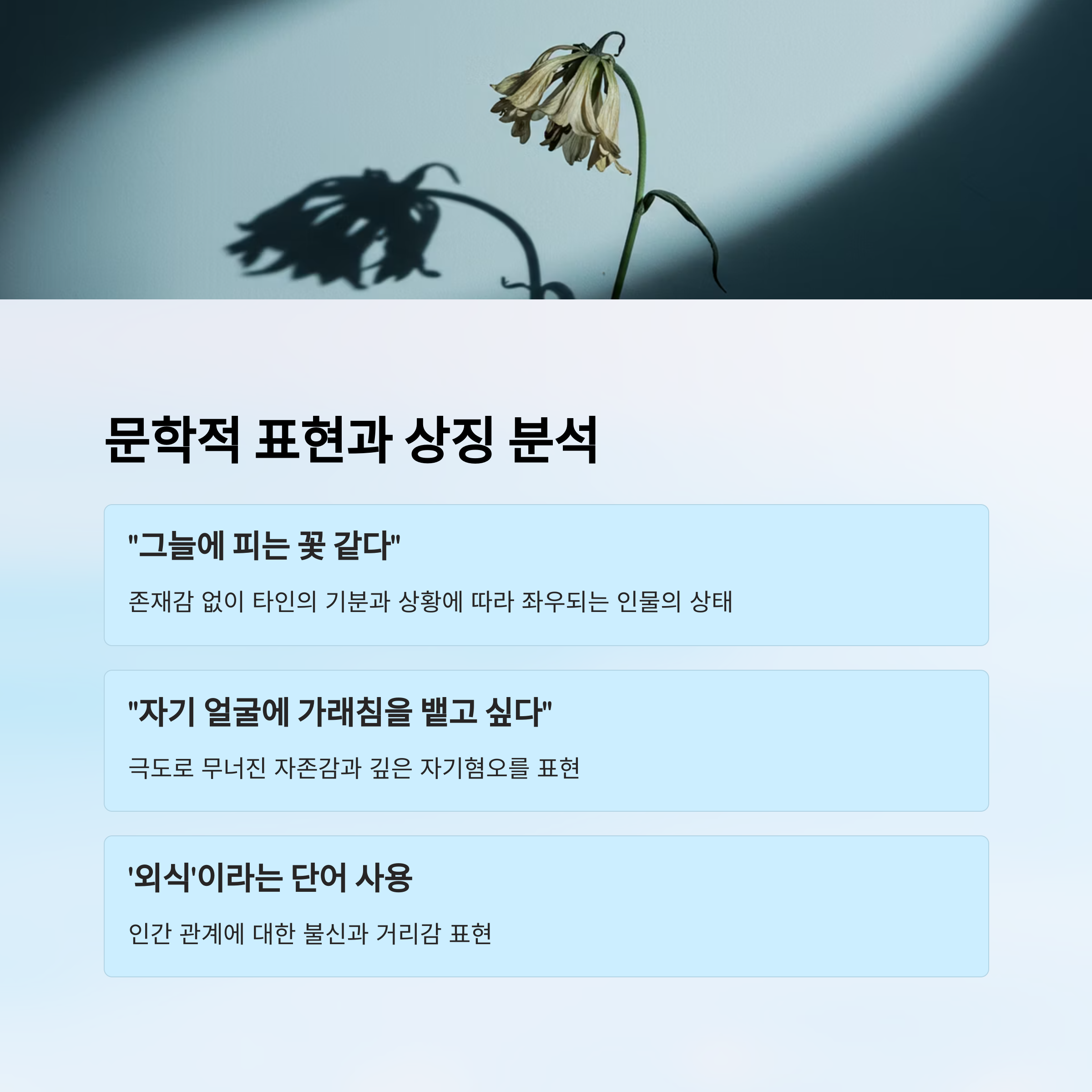 | 지식인의 좌절감 | 춘수는 '글을 쓰는 사람', 즉 지식인이지만 현실의 벽 앞에서는 철저히 무력한 존재로 그려집니다. |