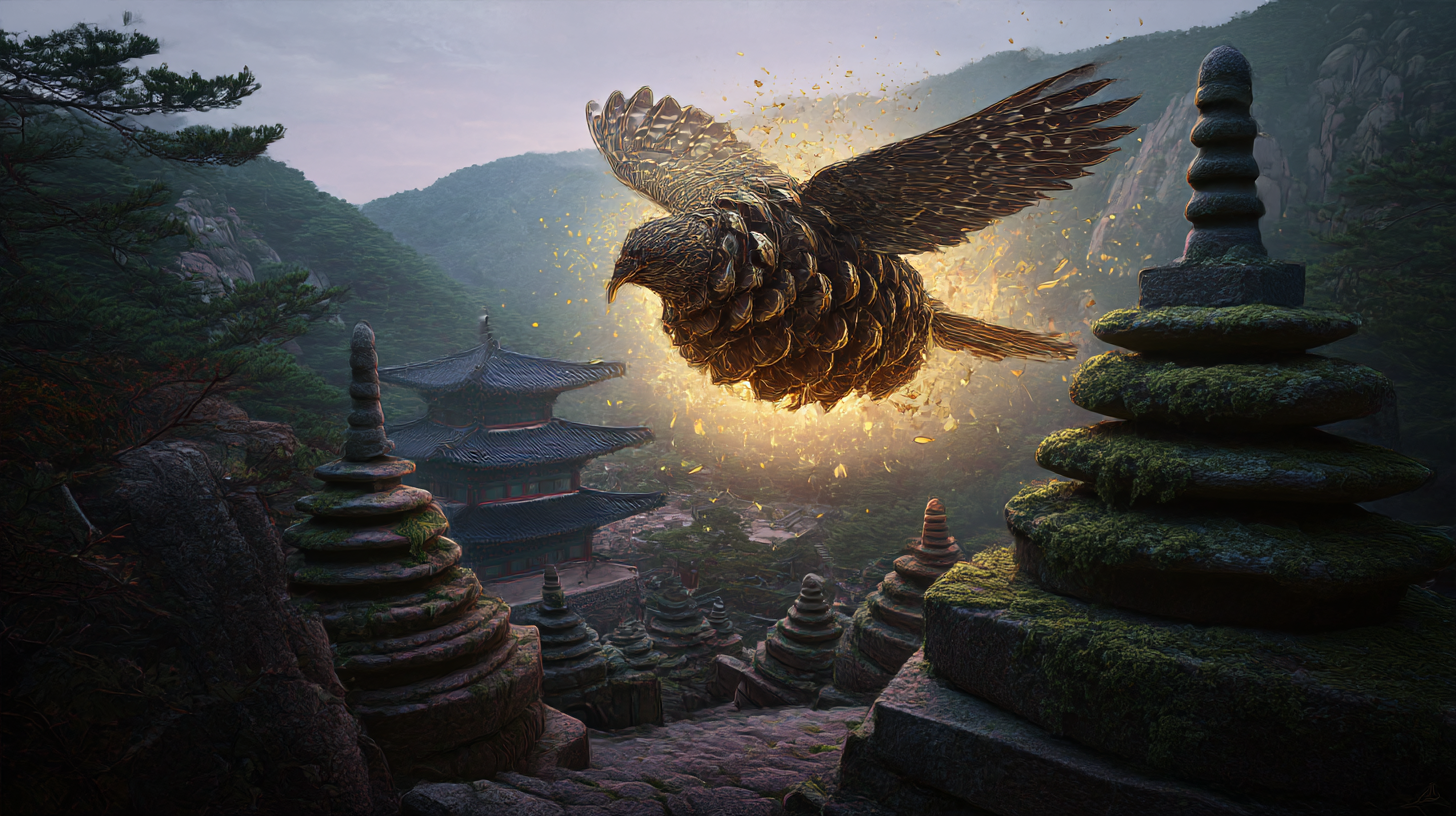 한 마리 새가 솔방울로 변하는 장면을 목격하며, 삶의 본질은 고정된 대상이 아니라 끊임없이 변화하는 것임을 깨닫게 되죠.