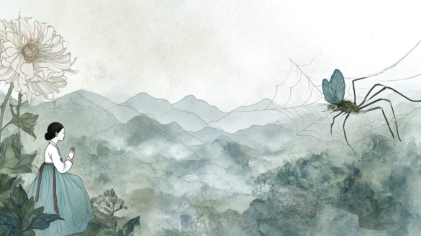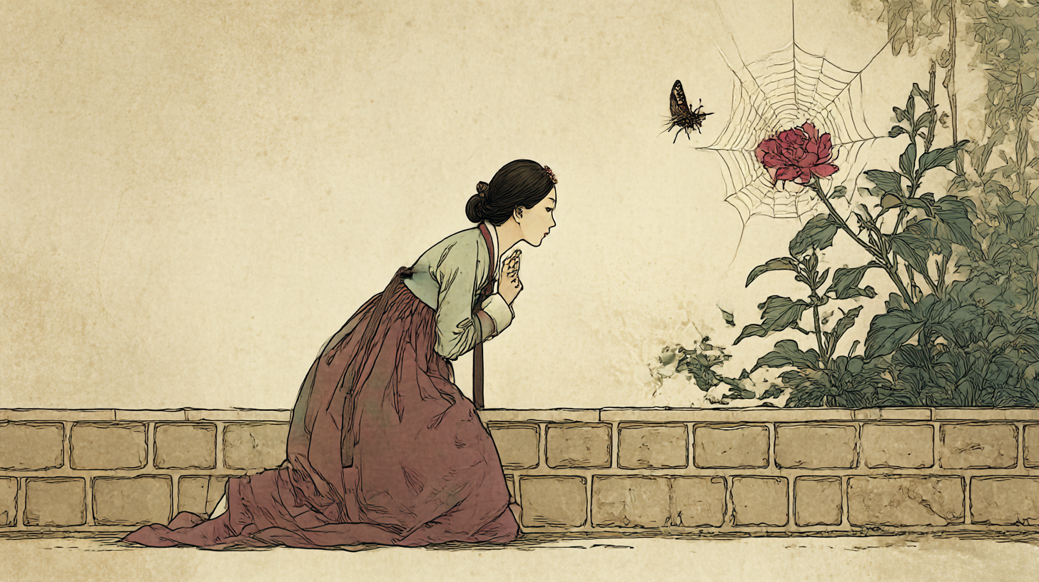 어휘가 좀 어려울 수 있는데요, 특히 '재삼진중(再三珍重)'과 '건위(愆違)' 같은 표현은 우리가 일상생활에서 쓰지 않는 한자어라 낯설게 느껴질 수 있어요. 하지만 이 표현들이 시의 감정을 더 강렬하게 만들어주고 있어요. '재삼진중'은 화자가 거미에게 얼마나 간절하게 부탁하는지를 보여주고, '건위'는 임의 잘못을 지칭하는 표현인데, 이런 무거운 표현을 사용함으로써 화자의 상처가 얼마나 깊은지를 암시합니다.
