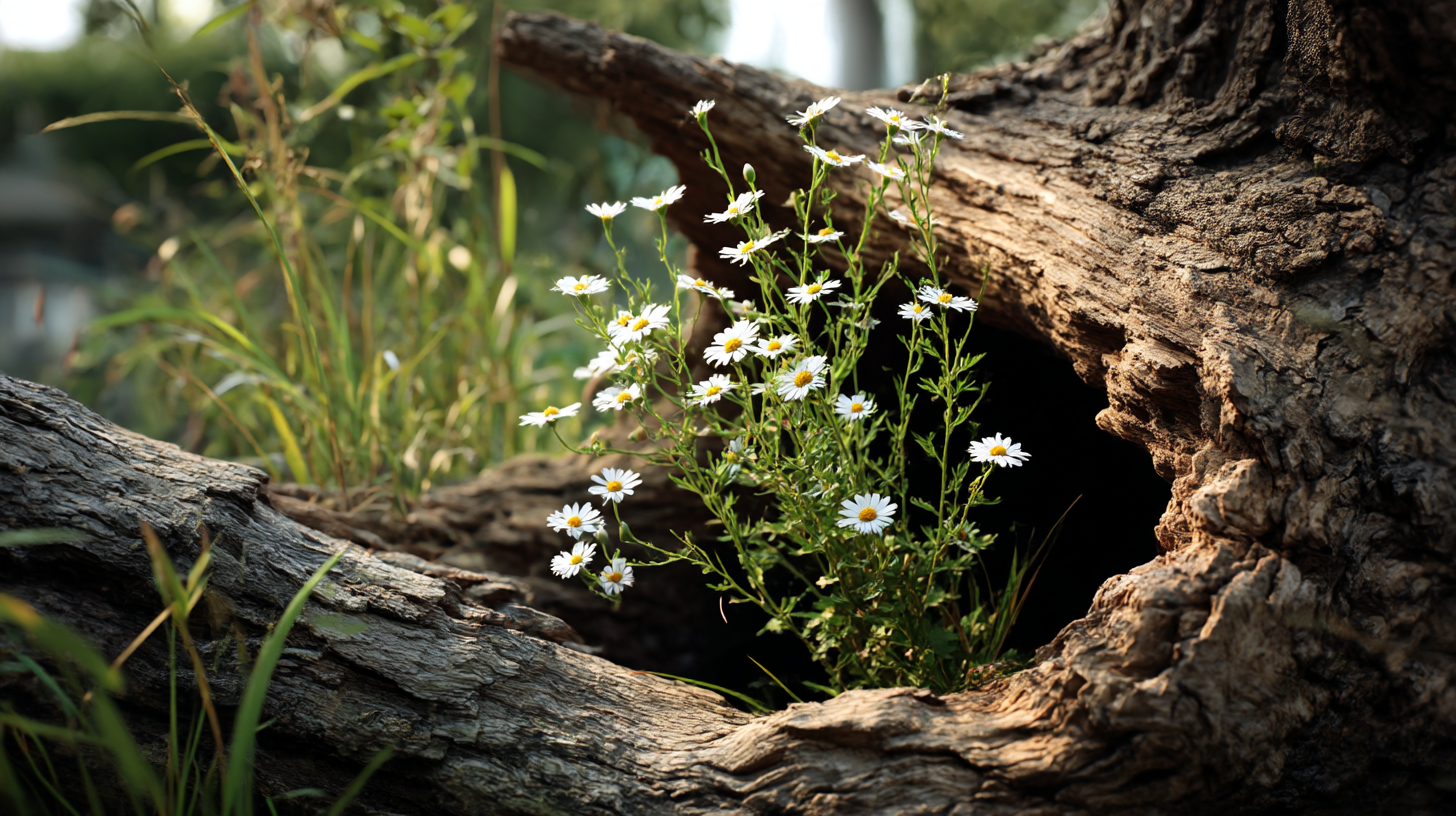 썩은 몸통은 상처와 소멸을, 그 속에서 피어나는 풀과 꽃은 회복과 생명 탄생을 상징하는 강력한 이미지입니다.