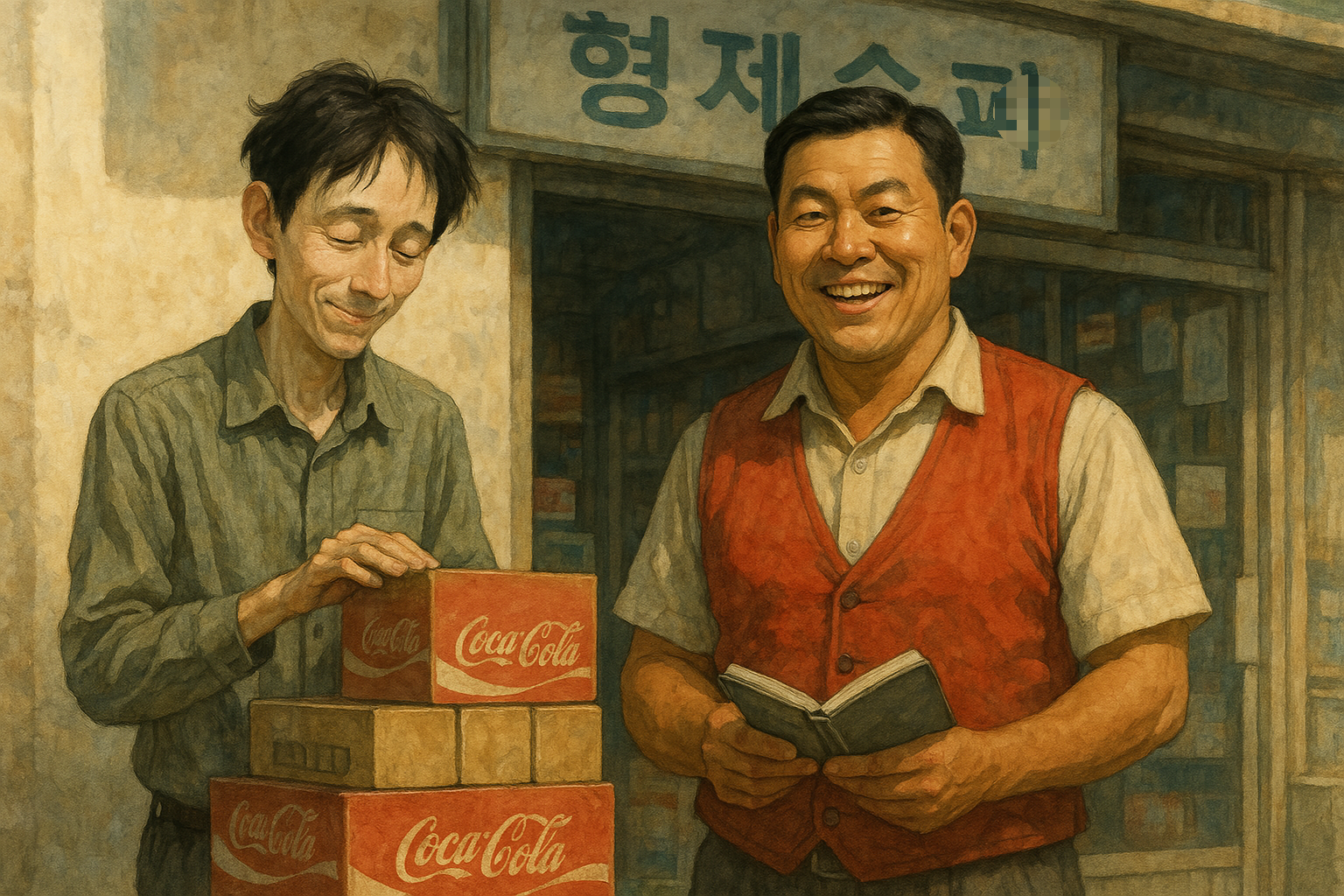 장면 2: 어느 날, 나는 몽달 씨가 김 반장네 슈퍼에서 일하는 것을 봤어요. 그런데 몽달 씨는 얼마 전에 심하게 맞고 열흘간이나 누워있었던 사람이에요. 더 이상한 건, 김 반장이 몽달 씨를 쫓아낸 적이 있는데도 몽달 씨가 웃으면서 일하고 있다는 거예요.