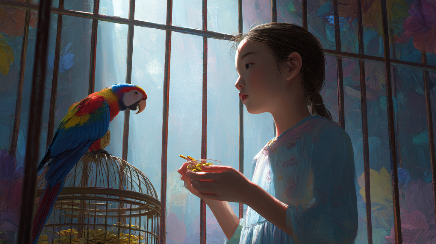 아주 늙은 앵무새 한 마리가 그에게 해바라기 씨앗을 갖다 주자, 해는 그의 어린 시절 감옥으로 들어가 버렸네.