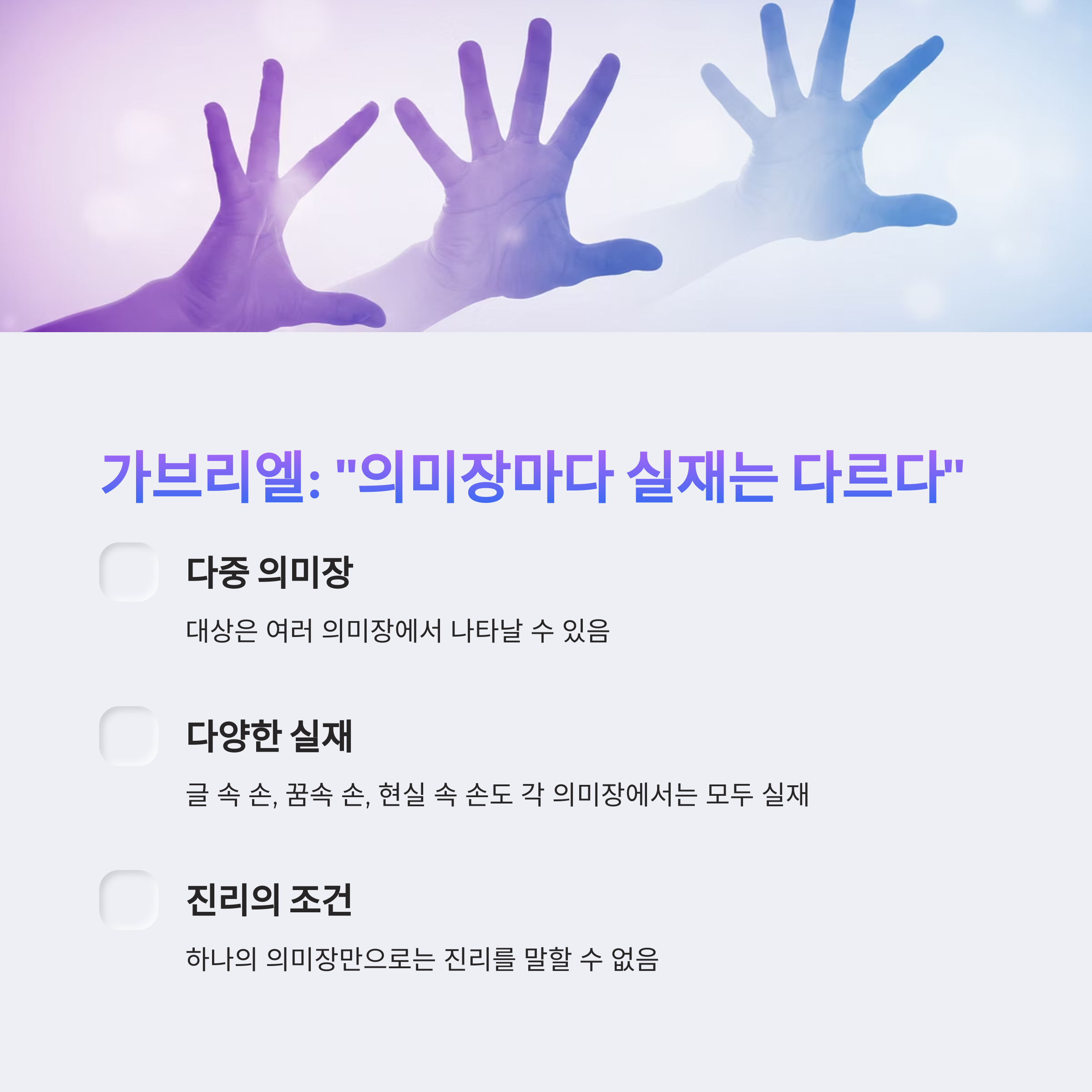 | 가브리엘 (나 지문) | 의미장 | 어떤 대상이 구체적이고 특정한 방식으로 나타나는 조건이나 배경 (실재를 설명하는 틀) |