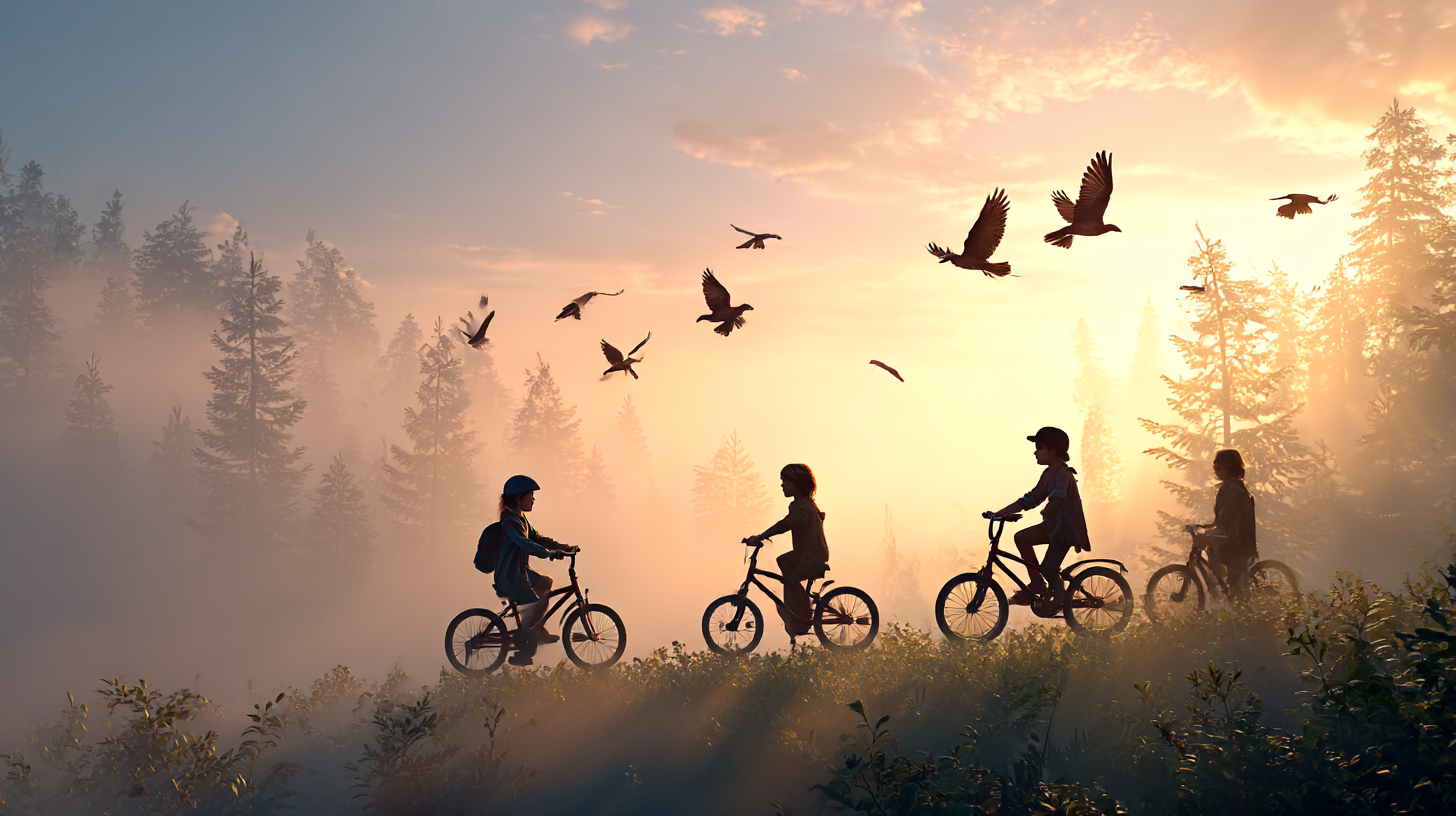 "그때쯤이면 아이들도 산란한 꿈에서 깨어나 / 자전거의 페달을 밟고 검은 숲 위로 오른다" → 아이들의 활발한 모습과 상승적 이미지가 겹쳐지며, 에너지와 생동감이 전달됩니다.