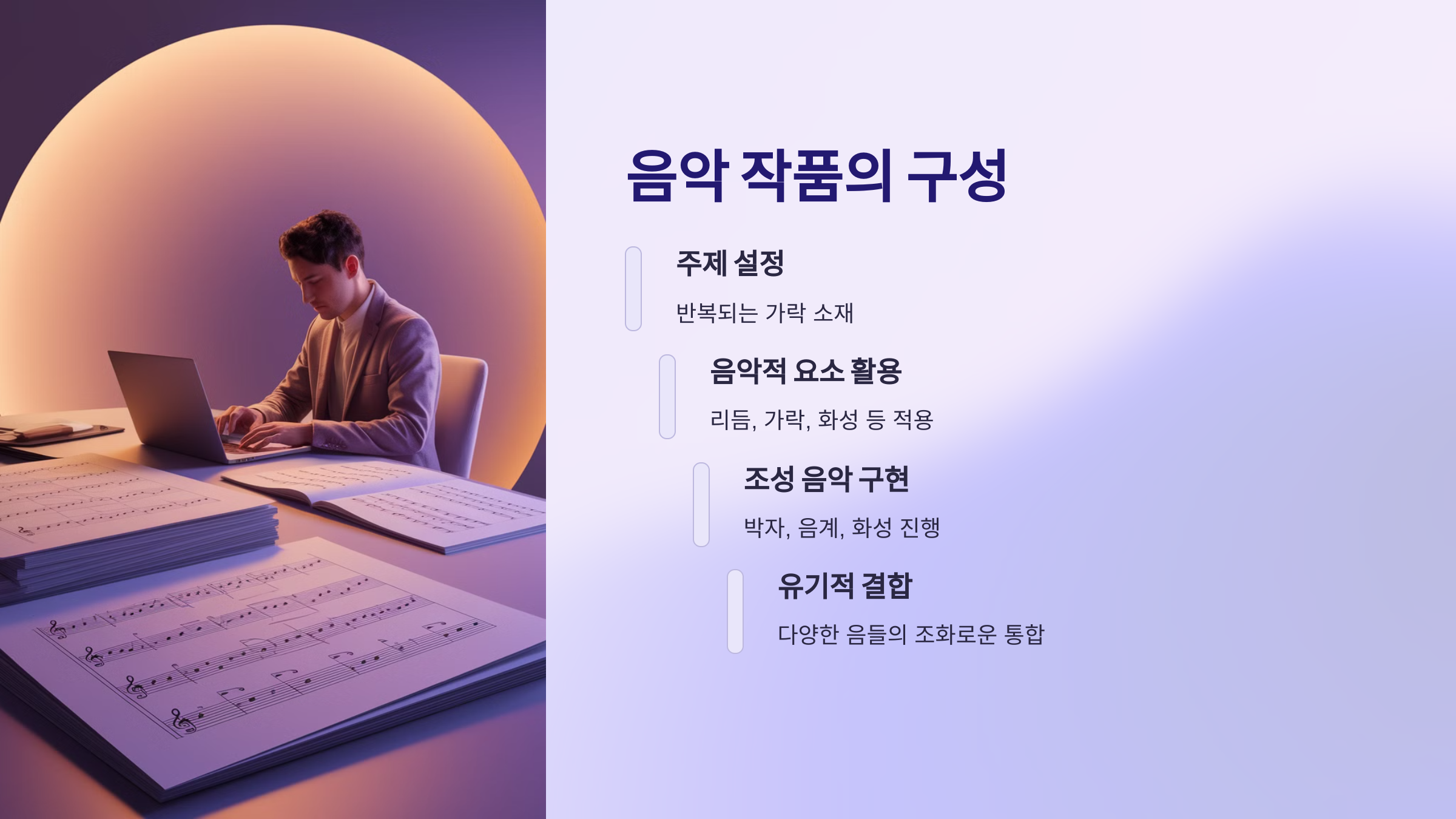 결국, 이 지문의 핵심은 아름다운 음악이 단순히 듣기 좋은 소리의 나열이 아니라, 다양한 음악적 요소(리듬, 가락, 화성, 셈여림, 음색 등)가 유기적으로 결합되어 만들어진다는 것이에요. 이 모든 요소들이 조화롭게 어우러질 때 비로소 아름다운 음악이 완성된답니다!