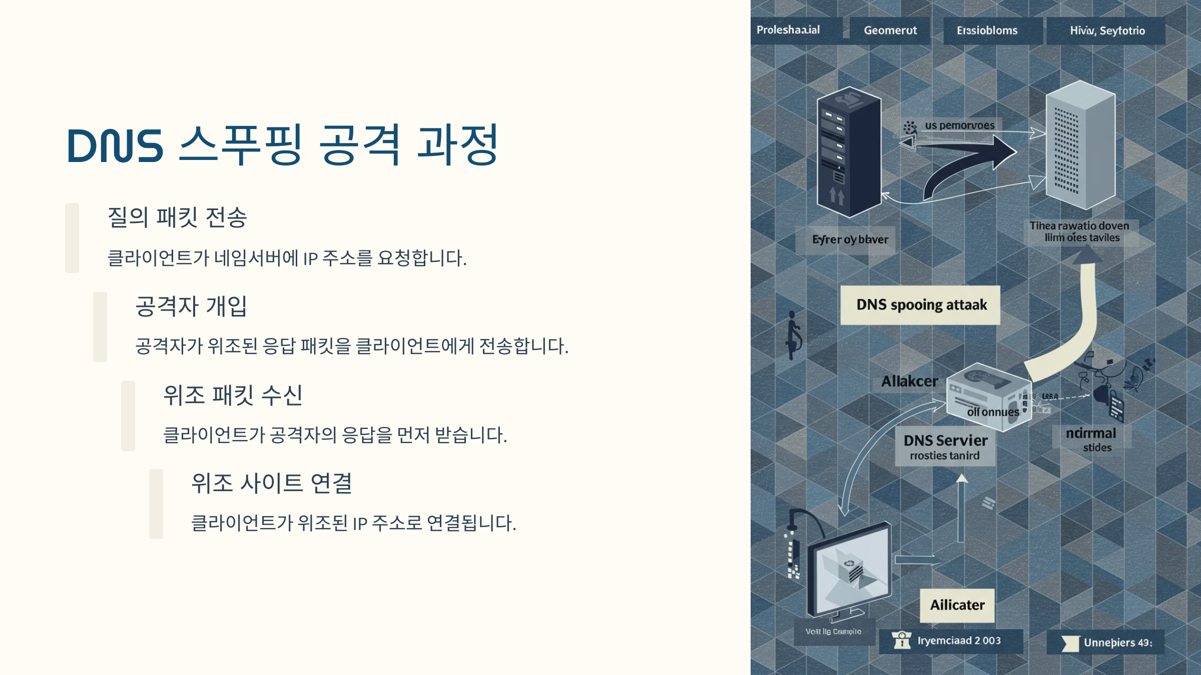해커가 네임서버보다 먼저 가짜 IP 주소를 보내 사용자를 위조 사이트로 유도하는 공격 방식입니다.
