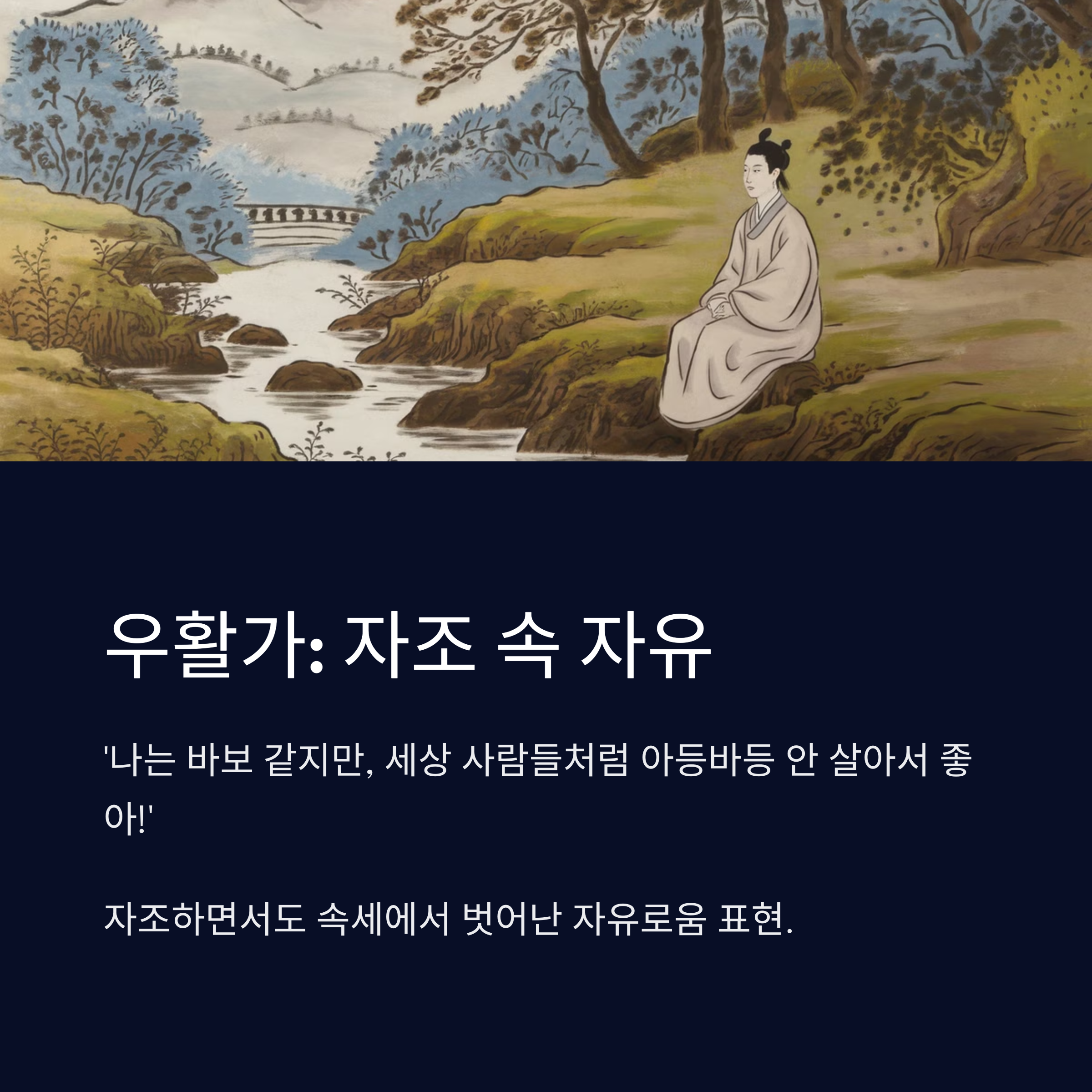 | 우활가 | ‘나는 좀 바보 같아 보이지만, 그래도 세상 사람들처럼 아등바등 안 살아서 좋아!’ 약간은 자조하면서도, 속세의 시끄러움에서 벗어나 자유롭게 살고 싶은 마음이 담겨 있어요. |
