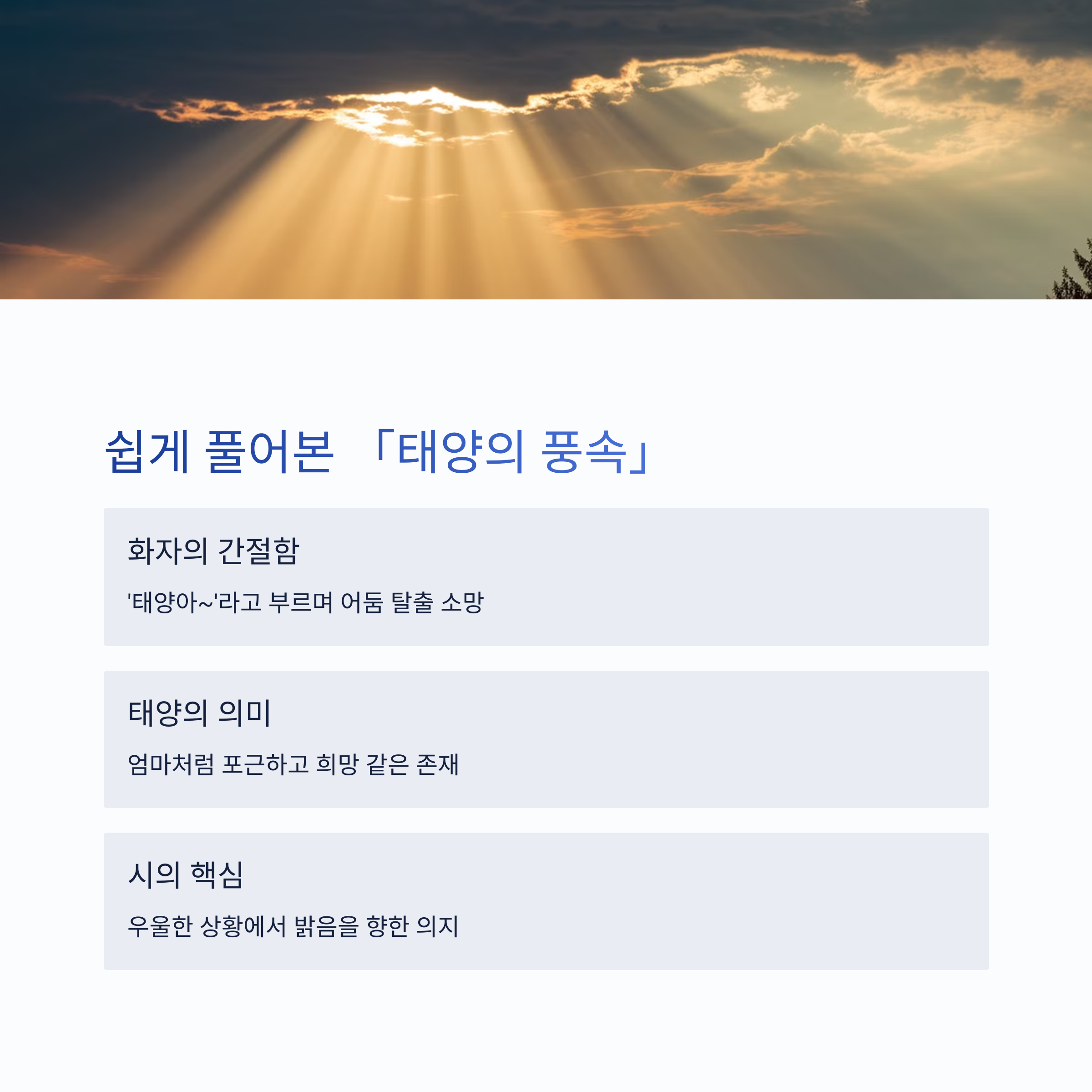 - ‘태양’은 단순한 자연물이 아니라 절대적 구원자, 생명력의 상징이에요.