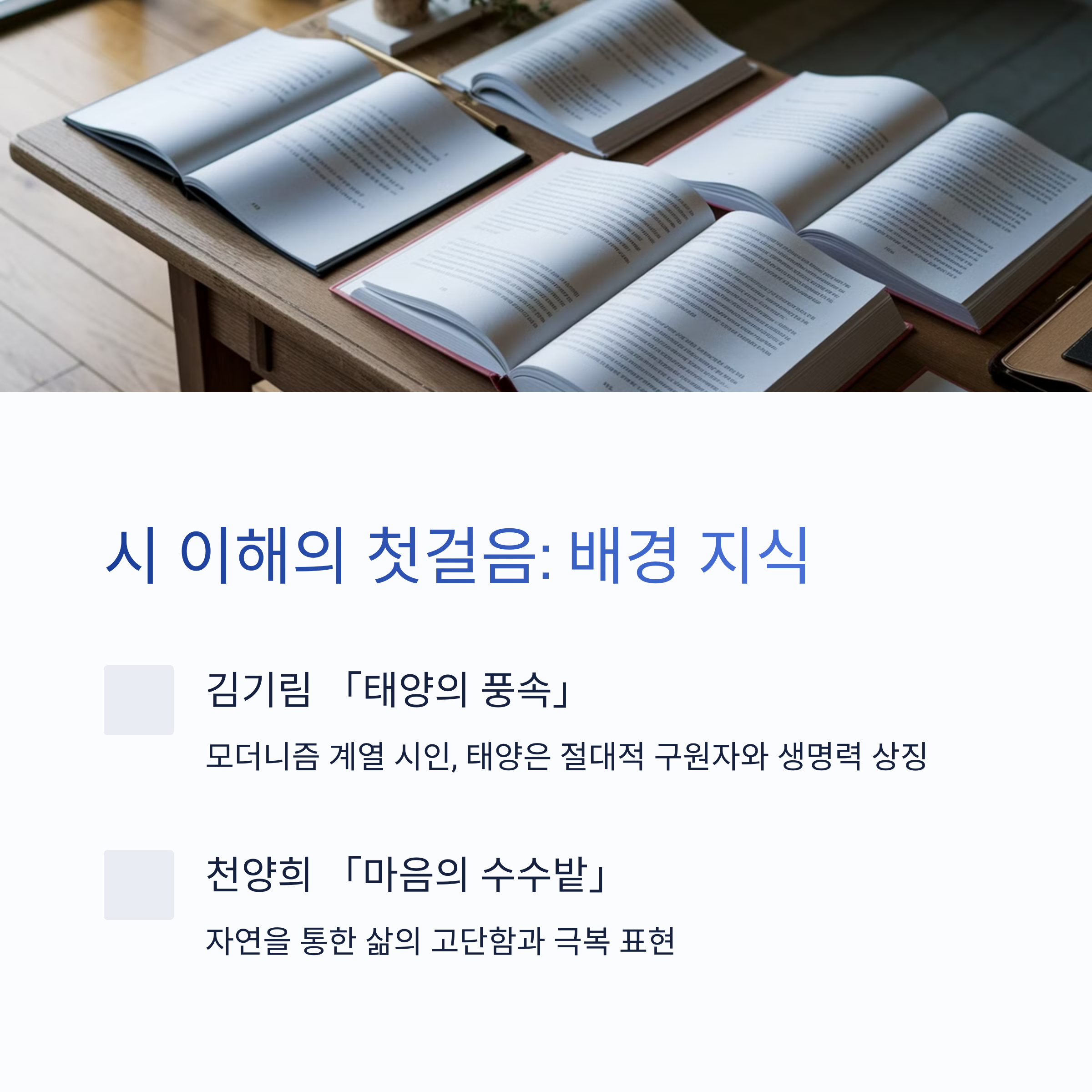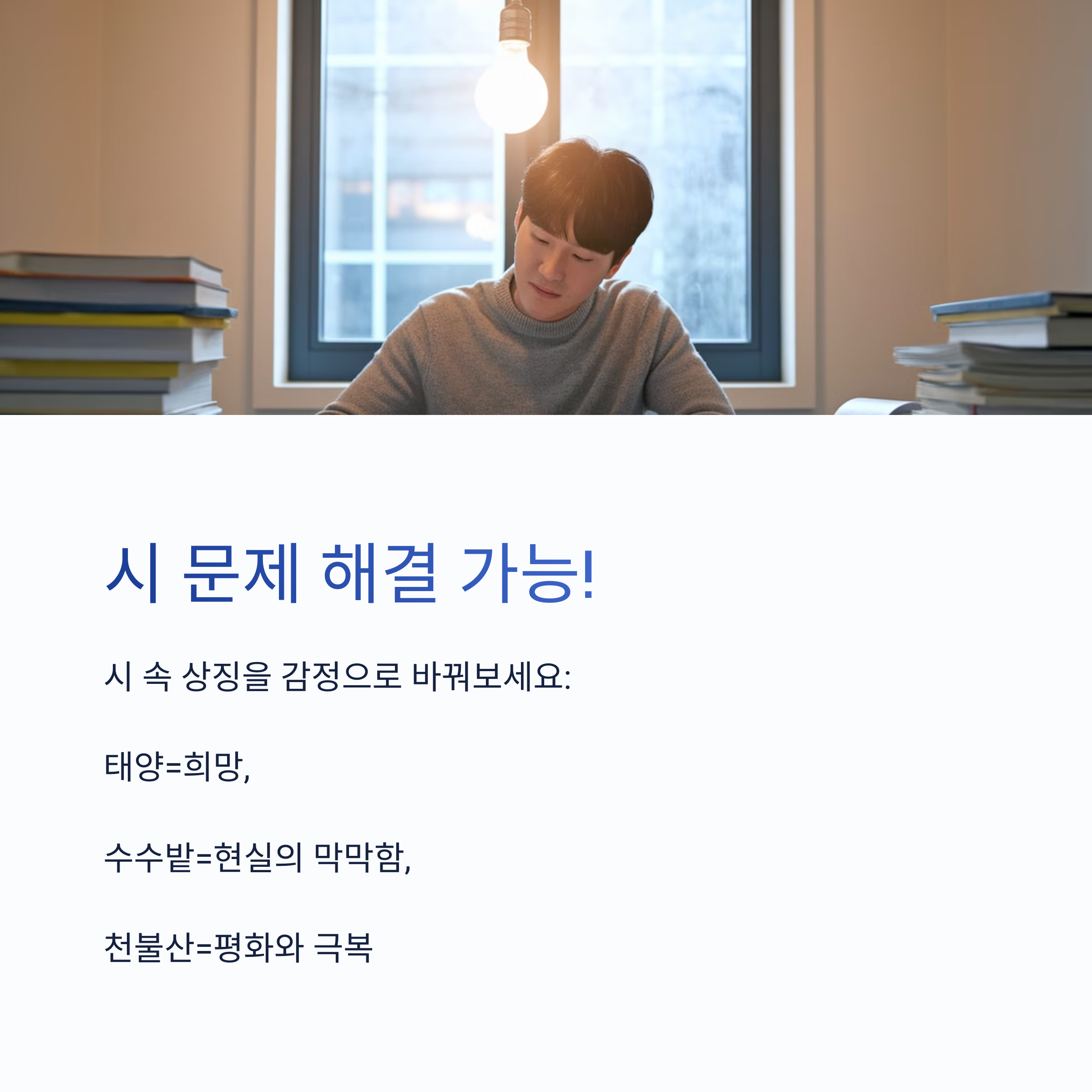 📌 지문의 맥락을 먼저 파악하고, 시적 대상(태양, 산 등)이 무엇을 의미하는지를 확인하세요.