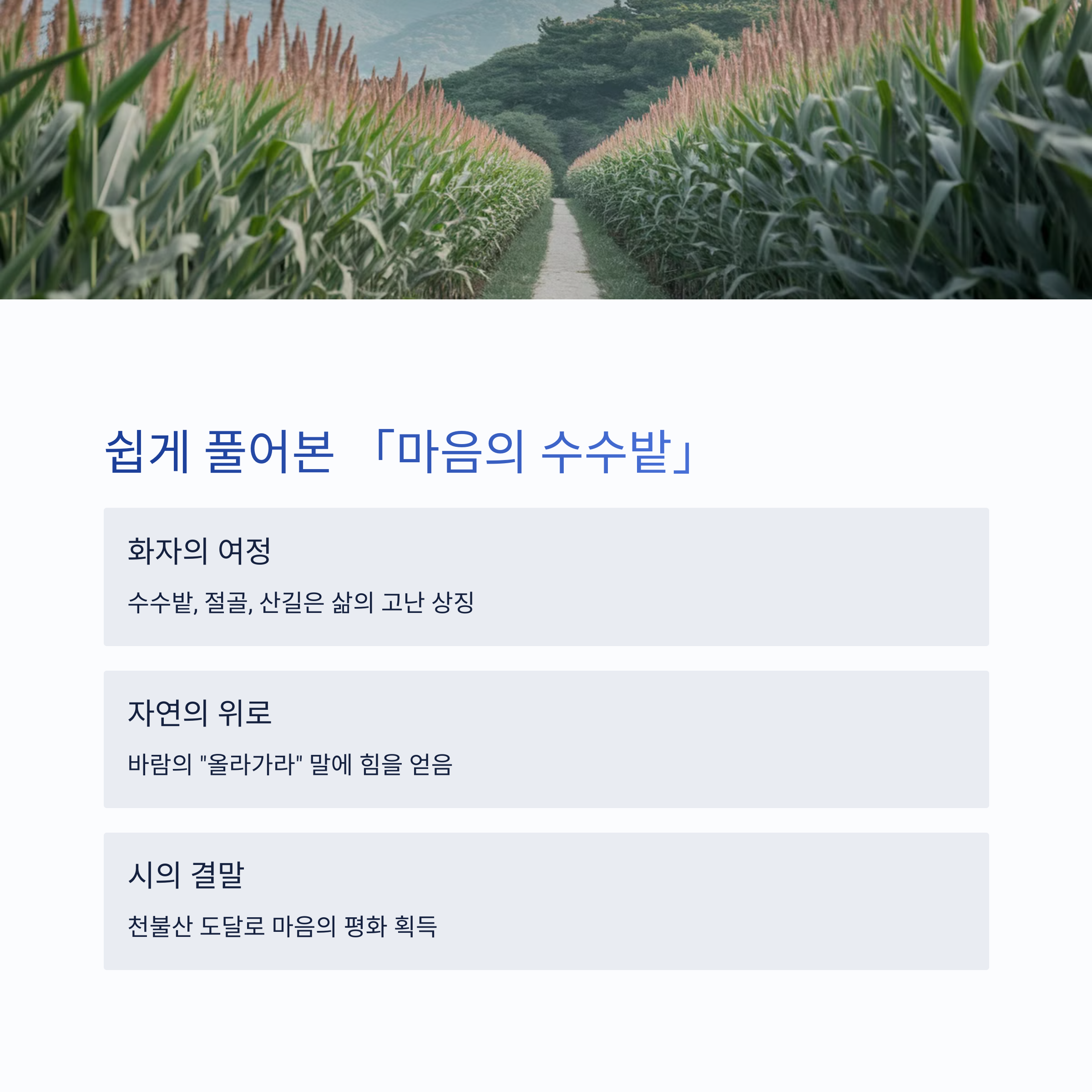 | 천양희 「마음의 수수밭」 | - 천양희 시인은 삶의 고단함과 극복을 자연에 빗대어 표현합니다. - ‘수수밭’, ‘보릿고개’, ‘천불산’ 등은 과거의 고난과 현재의 극복 의지를 보여주는 이미지입니다. - 특히 ‘천불산’은 영적인 해방과 마음의 평화를 상징해요. |