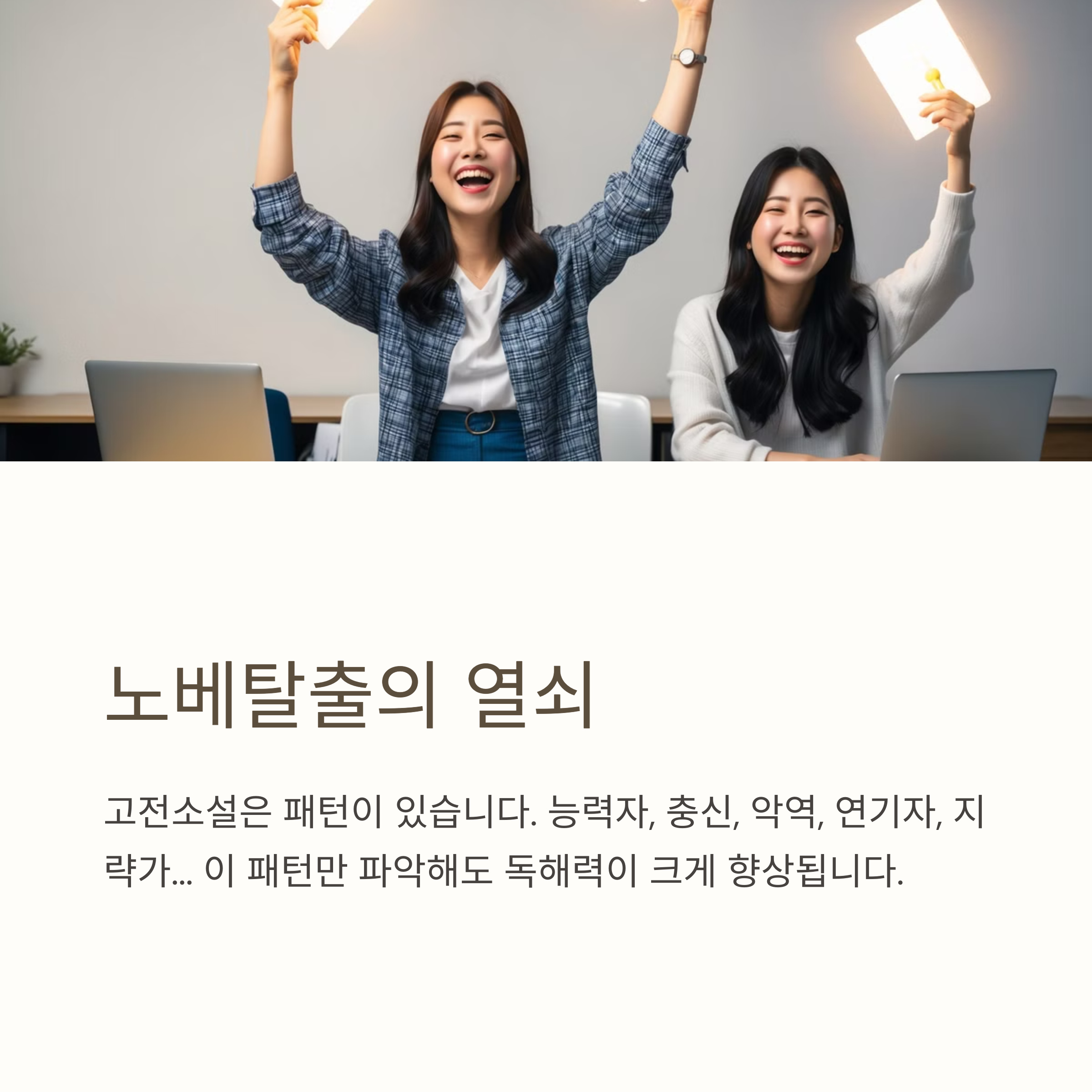 이제 고전소설이 더 이상 두렵지 않죠? 캐릭터성에 집중하면 노베탈출은 이미 시작되었습니다! 다음 고전소설도 함께 정복해봐요! 😊