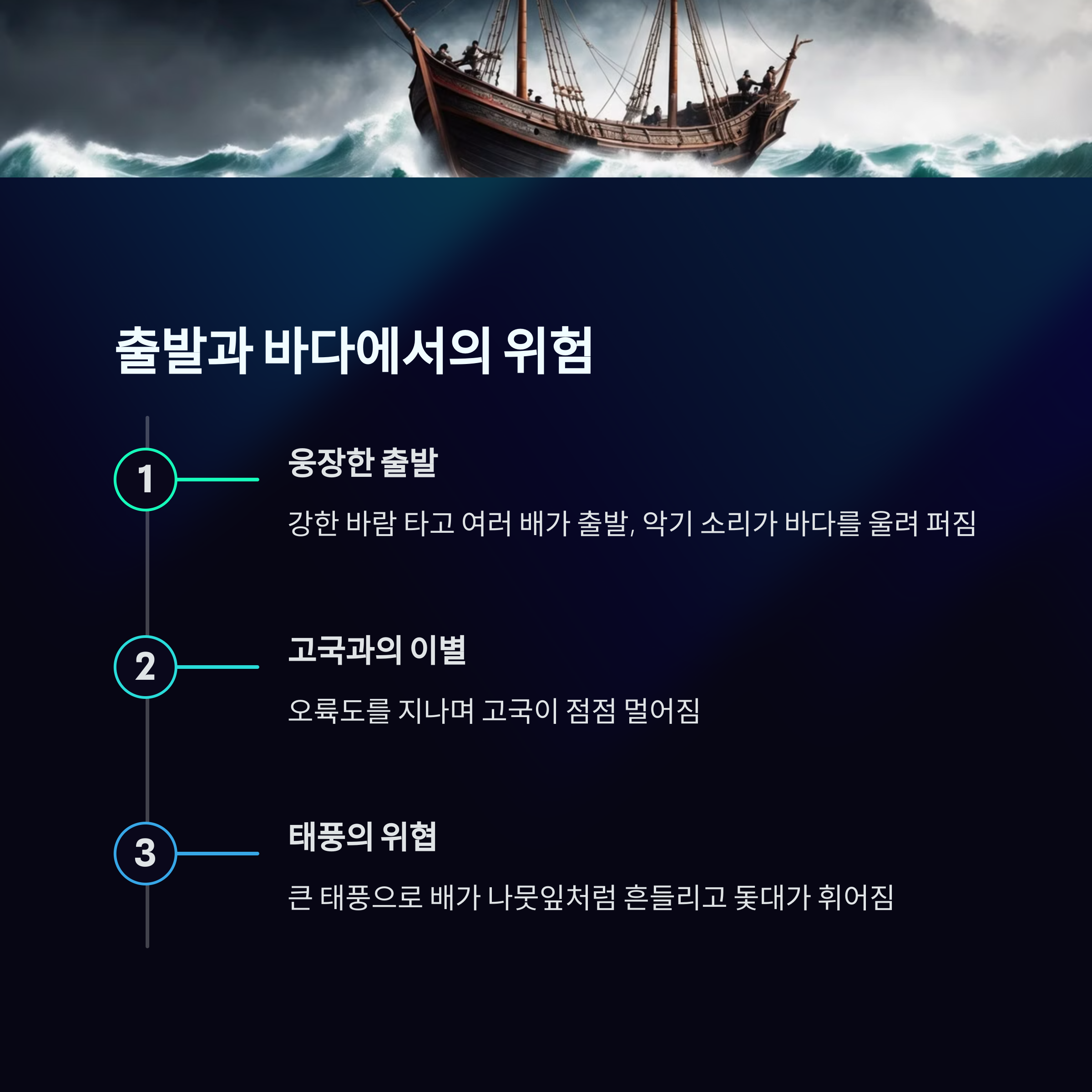 | 범선(돛단배) 관련 지식 | 지문에 언급된 '쌍돛대', '초석 돛' 등의 표현은 범선(돛단배)을 묘사한 것입니다. 당시 바람을 동력으로 하는 배는 현대의 선박과 달리 바람과 파도에 취약했습니다. |