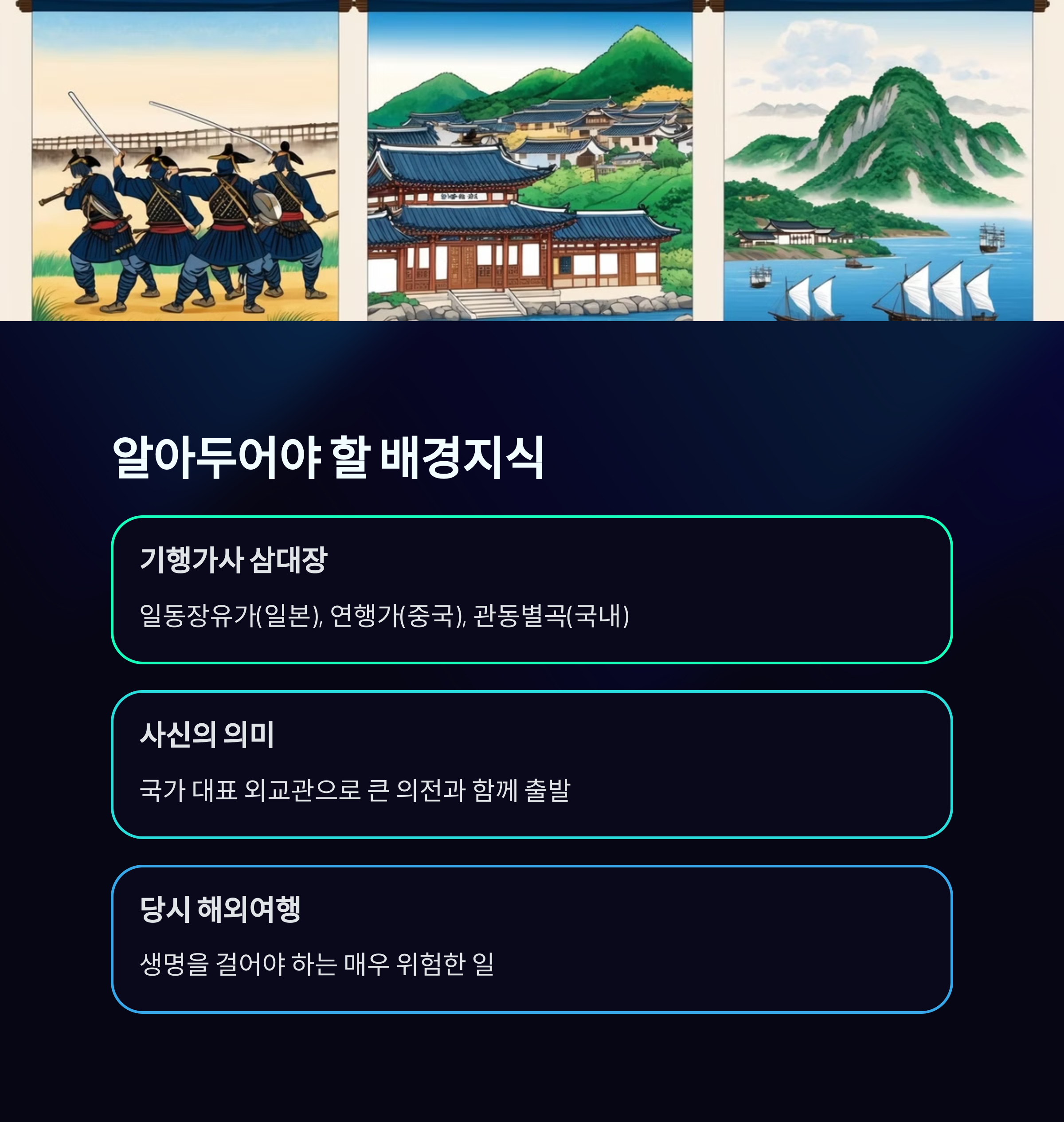 | 당시 해외여행의 위험성 | 조선시대에는 해외로 가는 것, 특히 배를 타고 바다를 건너는 것은 생명을 걸어야 하는 매우 위험한 일이었습니다. 죽음의 위협을 느끼고 가족들도 다시 볼 수 없을지 모른다는 생각에 울며 보냈을 정도입니다. |