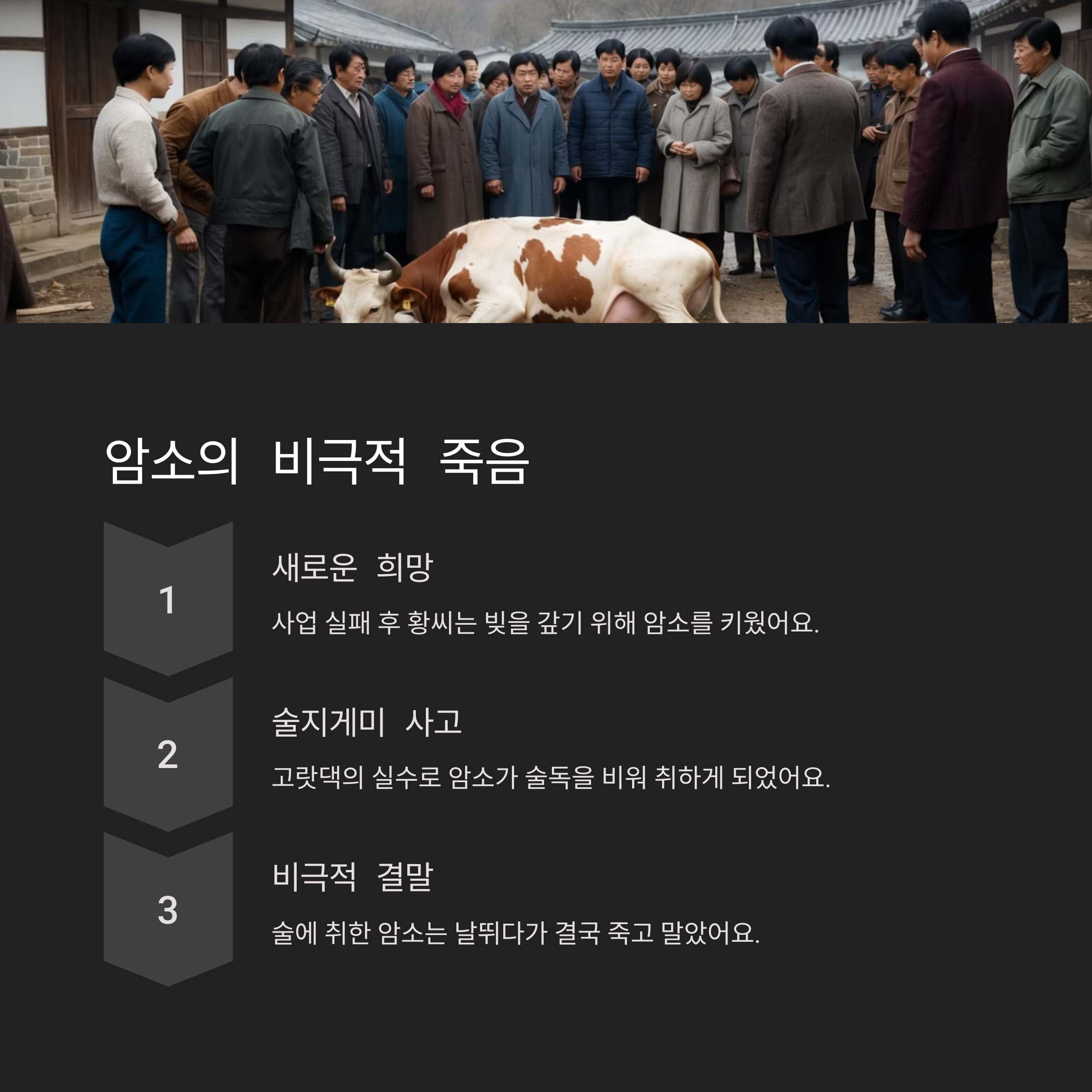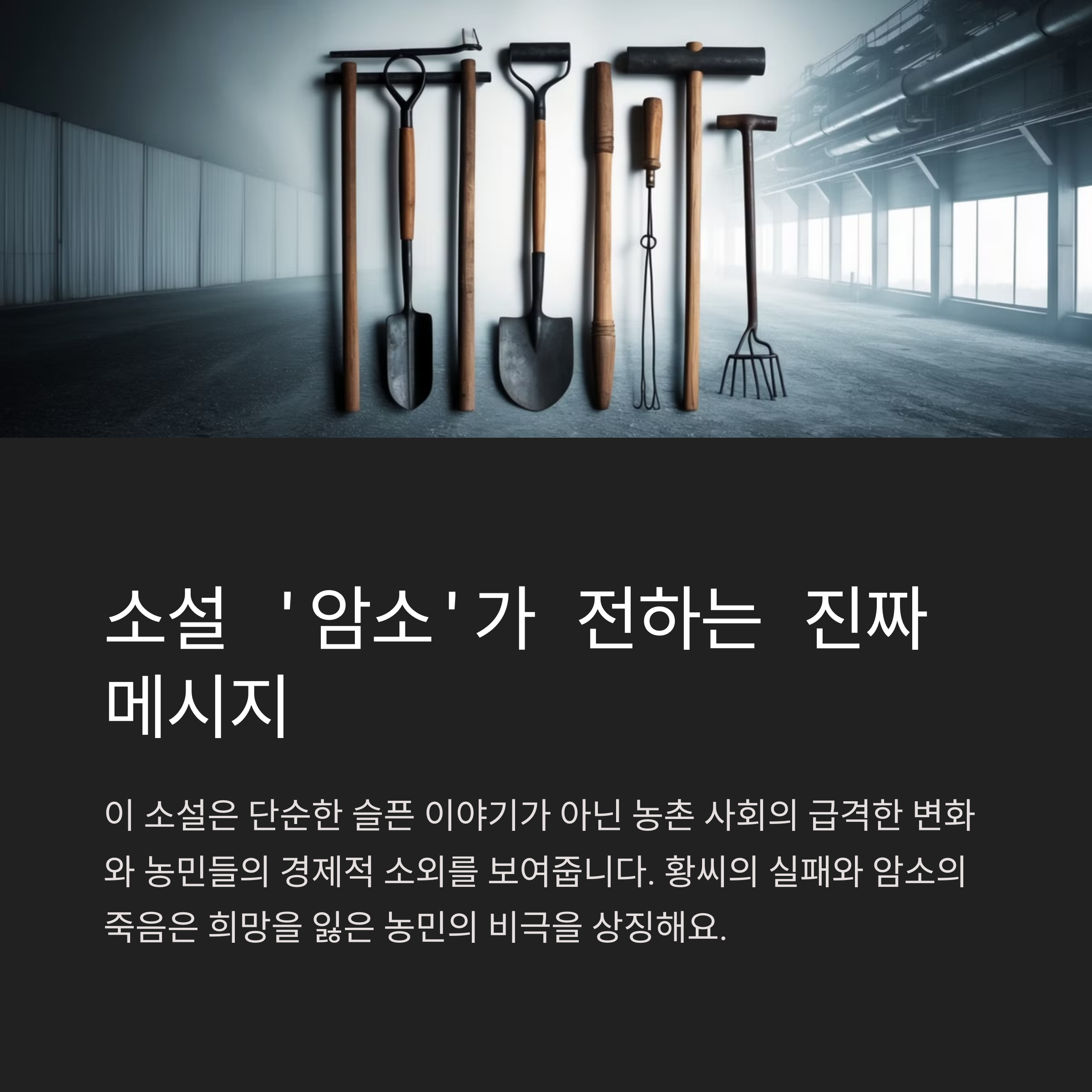 ⚠️ 주목 포인트: 이 소설은 단순한 슬픈 이야기가 아니라, 농촌 사회의 급격한 변화와 농민들의 경제적 소외를 보여주고 있어요. 황씨의 사업 실패는 산업화 시대에 적응하지 못한 농촌의 현실을, 암소의 죽음은 마지막 희망마저 사라진 농민의 비극을 상징합니다.