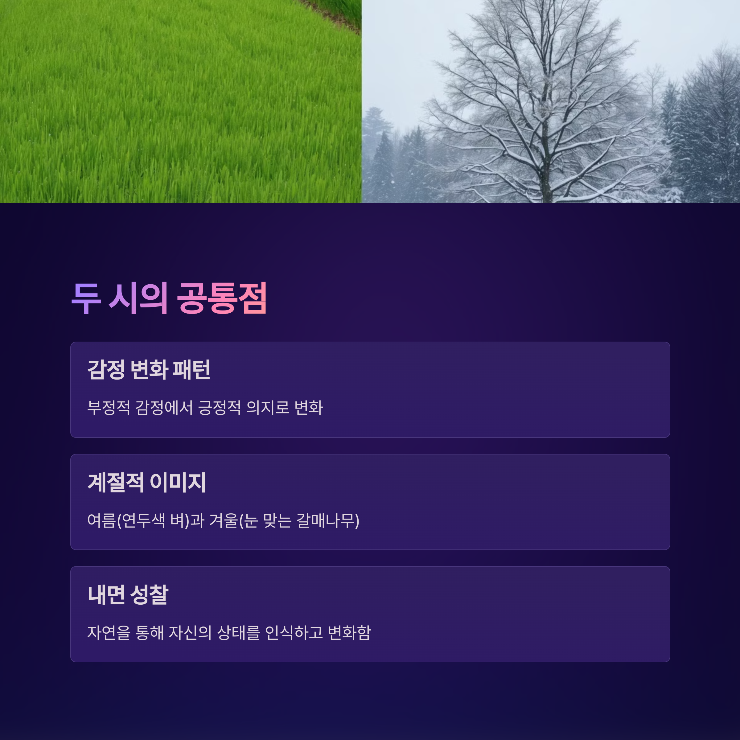 두 시 모두 화자가 무기력하고 슬픈 상태에서 시작해서, 어떤 계기(울음/고개 들기)를 통해 희망과 의지를 갖는 쪽으로 변화해요. 또한 두 시 모두 계절적 이미지(여름/겨울)를 활용해 화자의 상황을 더욱 선명하게 보여주고 있어요!