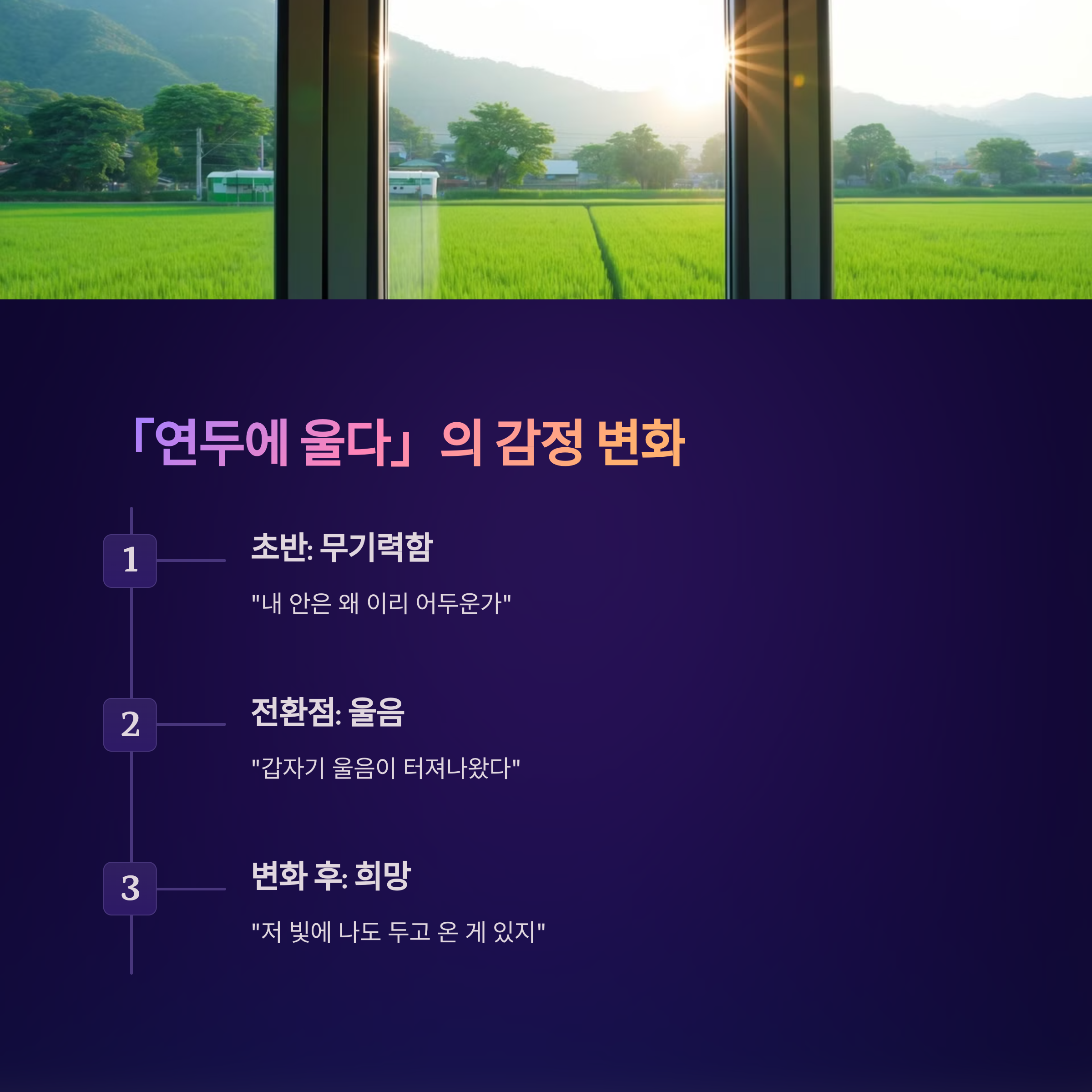 그런데 화자는 이런 생명력 넘치는 연두색 벼들을 보면서 "내 안은 왜 이리 어두운가"라고 자문해요. 이건 자신의 상태가 얼마나 생기 없고 무력한지를 깨닫는 순간이에요. 심지어 쏟아지는 햇빛도 결국엔 어두워질 거라고 중얼거리며 부정적인 생각을 하죠.