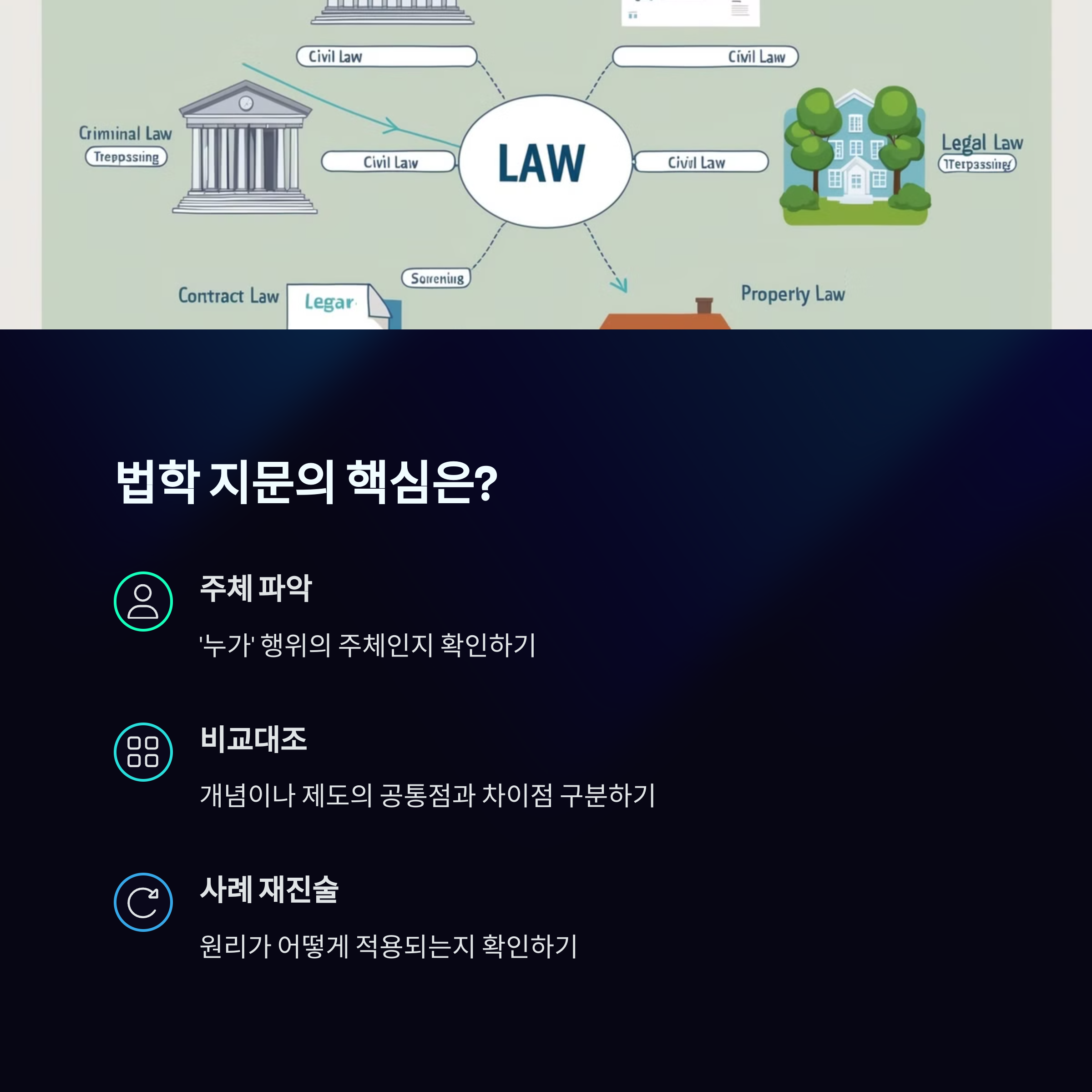 | 비교대조 활용하기 | 법학 지문은 대부분 둘 이상의 개념이나 제도를 비교하는 구조입니다. 공통점과 차이점을 구분해 정리하세요. | 형사법 vs 민사법 목적, 소송 당사자, 입증 방식 등의 차이점 |