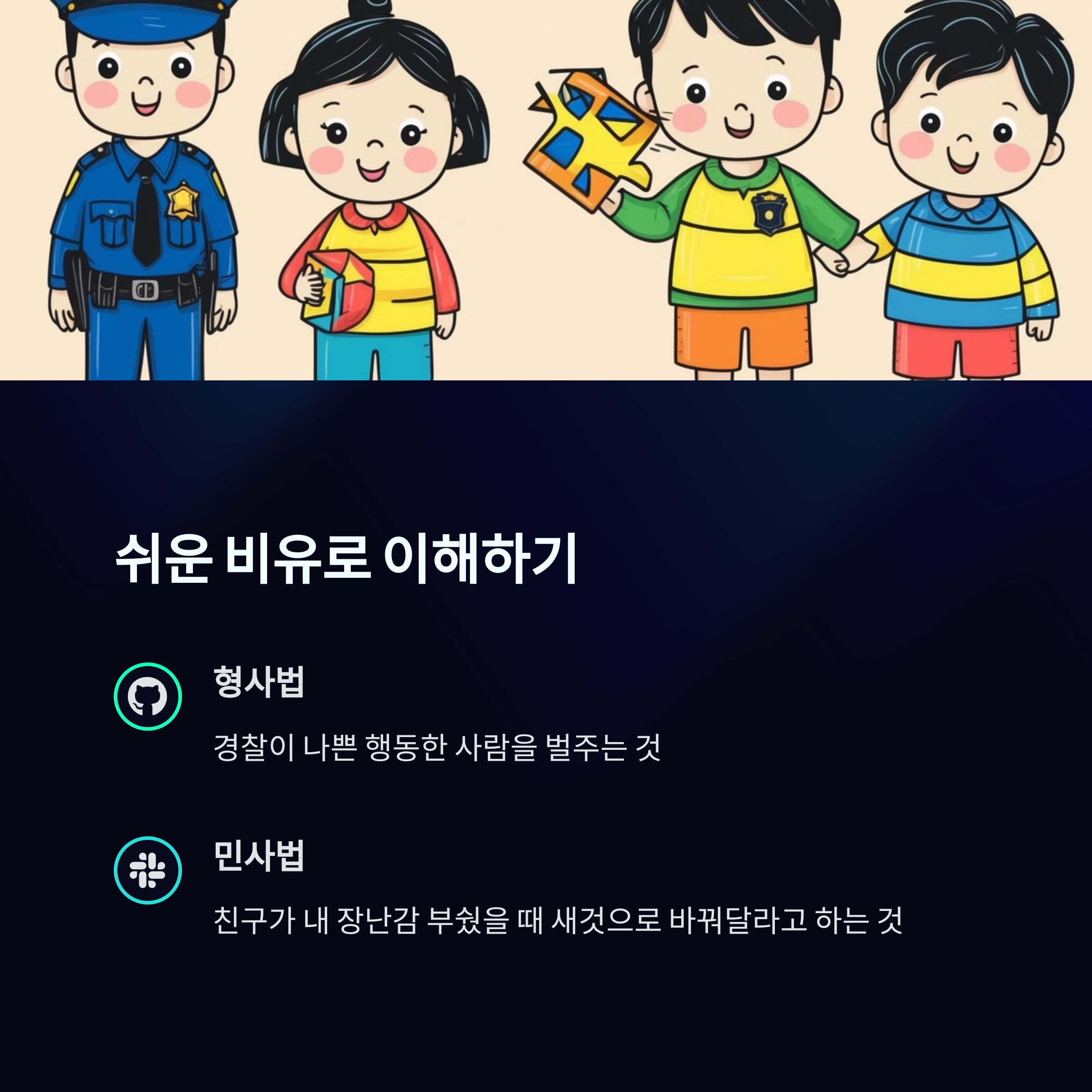 법학 지문이 어렵게 느껴지시나요? 걱정마세요! 초등학생도 이해할 수 있게 쉽게 풀어볼게요. 이 지문은 우리가 살면서 접할 수 있는 법의 두 가지 큰 종류를 비교하고 있답니다.