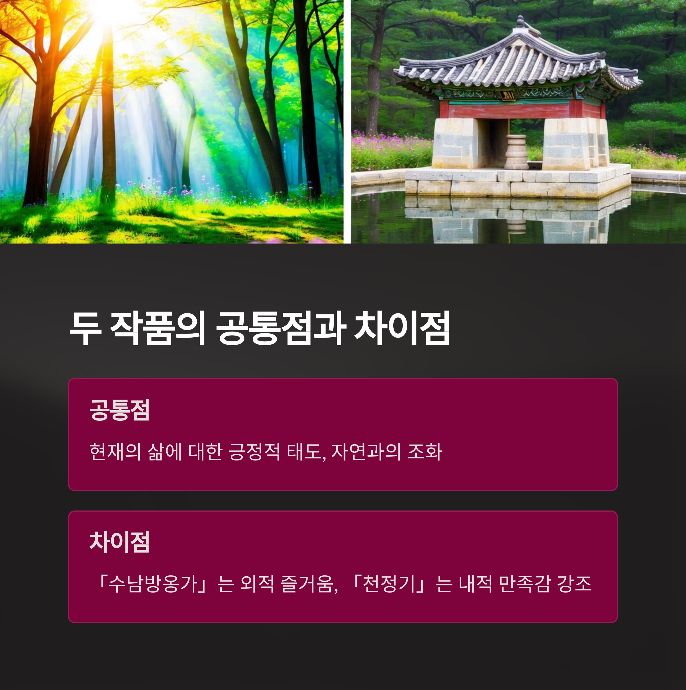 두 작품을 비교할 때는 표면적인 상황보다 작가의 태도와 가치관에 주목해야 해요. 「수남방옹가」는 자연의 아름다움을 감각적으로 묘사하며 자연에서 느끼는 즐거움을 직접적으로 표현하고 있고, 「천정기」는 우물이라는 상징을 통해 삶의 태도에 관한 교훈을 전달하고 있어요. 두 작품 모두 외적 성취나 출세보다는 내면의 만족과 가치를 중시하는 공통점이 있지만, 표현 방식과 강조점이 다르답니다. 「수남방옹가」는 자연과의 교감을 통한 즐거움을, 「천정기」는 세상의 평가에 휘둘리지 않는 내면의 덕성을 강조하고 있어요. 두 작품 모두 부정적인 세태 비판이나 갈등보다는 자신의 삶에 대한 긍정적 태도가 중심이 되고 있다는 점을 기억하세요!