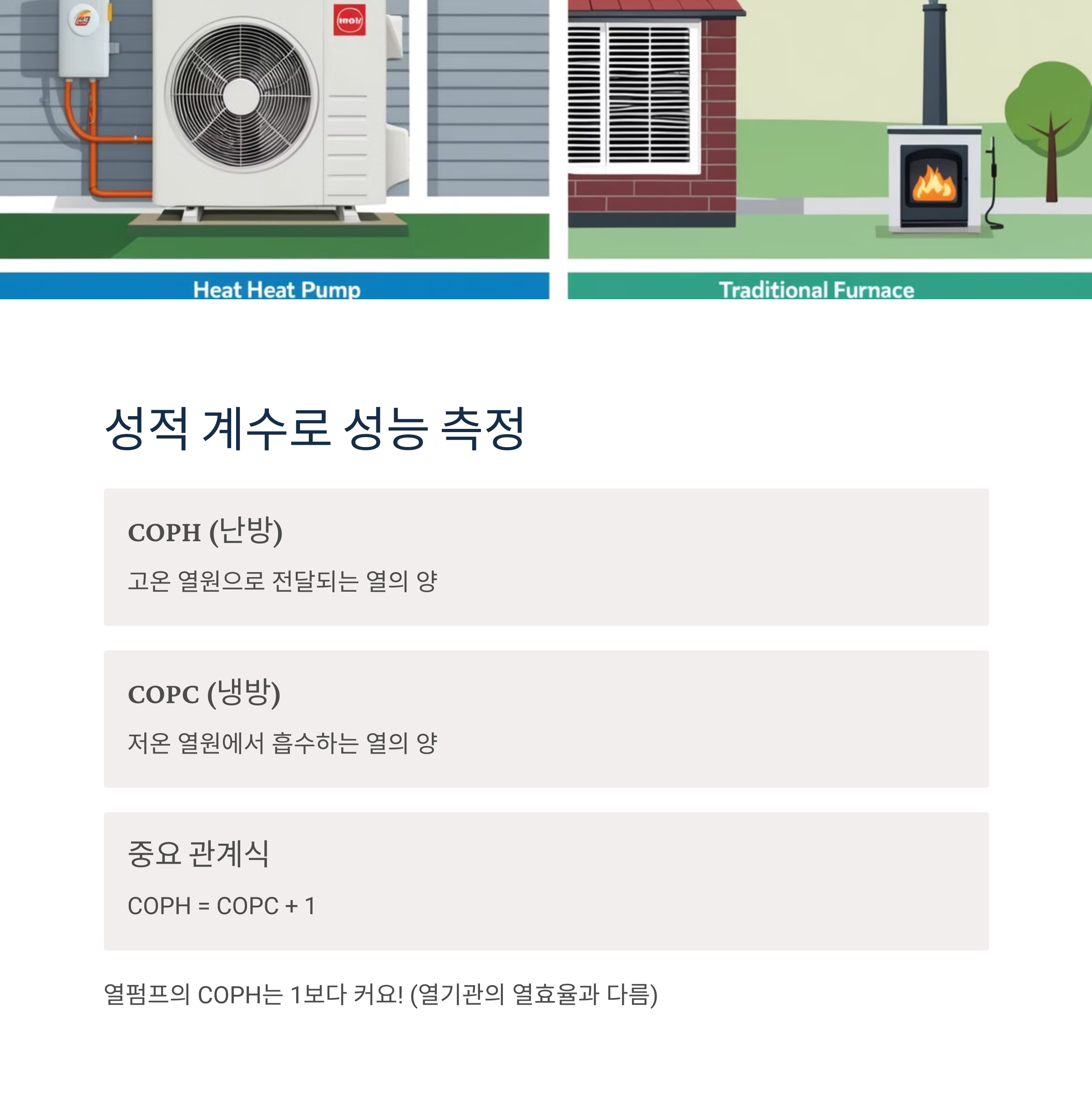 열펌프: 저온의 열원에서 열을 흡수하고 압축기에 전기 에너지를 투입해 고온의 열원으로 열을 방출 (COPH는 1보다 큼)
