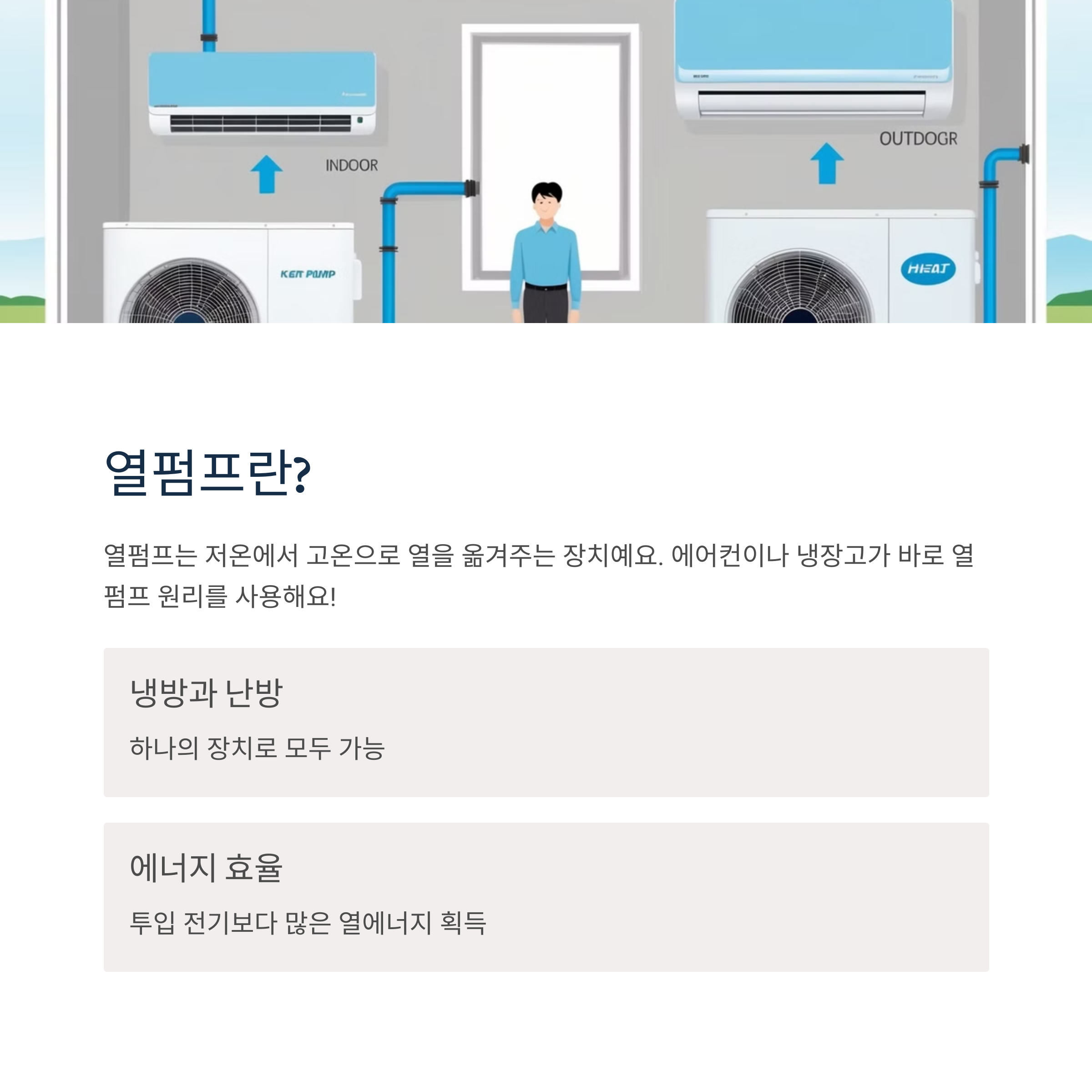 ✅ 일반 난방기기와의 차이점: 일반 난방기기는 난방만, 냉방기기는 냉방만 가능하지만, 열펌프는 냉방과 난방이 모두 가능한 만능 장치예요!