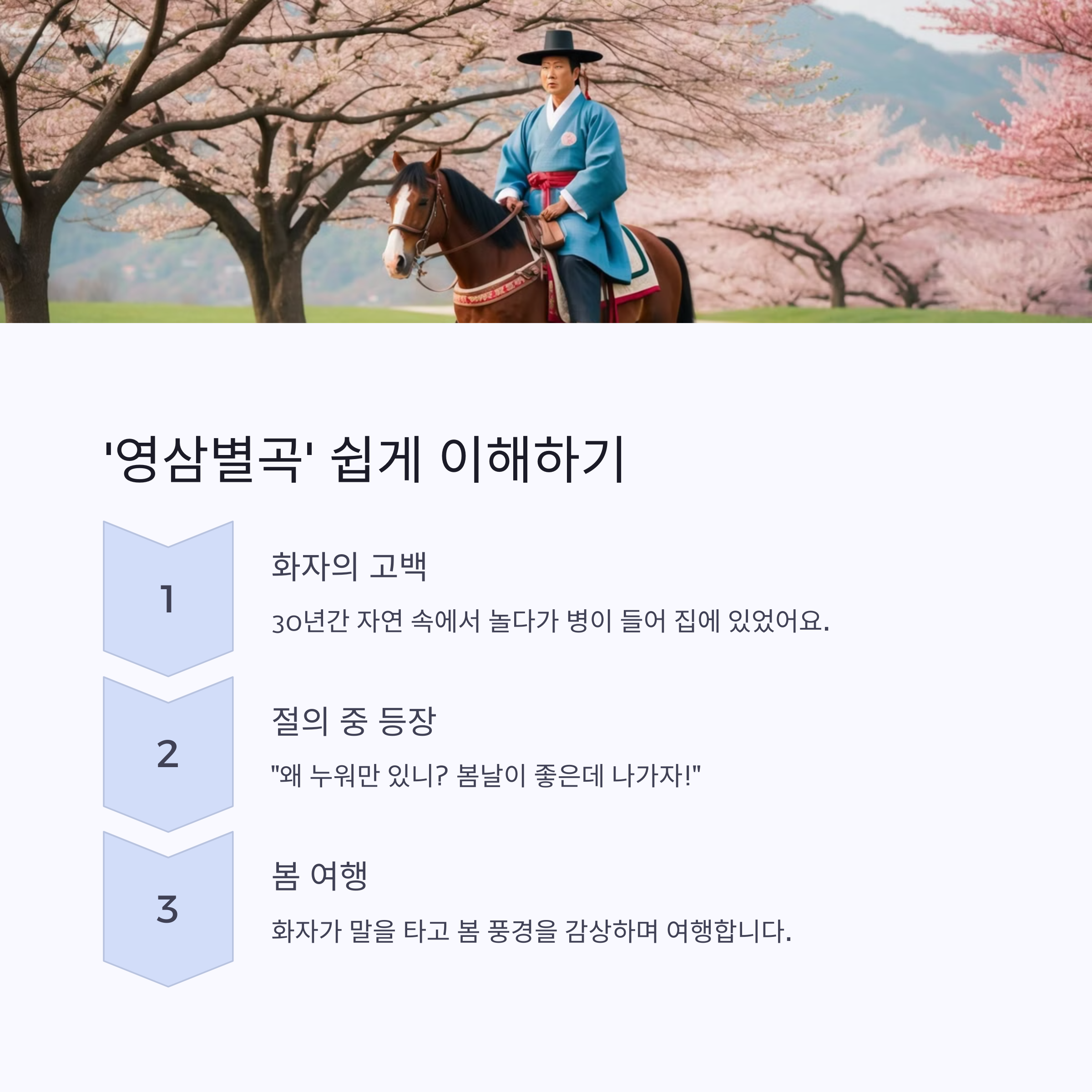 💡 비유로 이해하기: '영삼별곡'은 마치 여러분이 봄방학에 친구를 만나 함께 놀러 가는 여행 일기를 쓴 것과 비슷해요. 중간에 친구가 말을 걸고, 여러분이 대답하고, 또 다른 사람들과 대화하는 상황이 모두 담겨 있답니다!