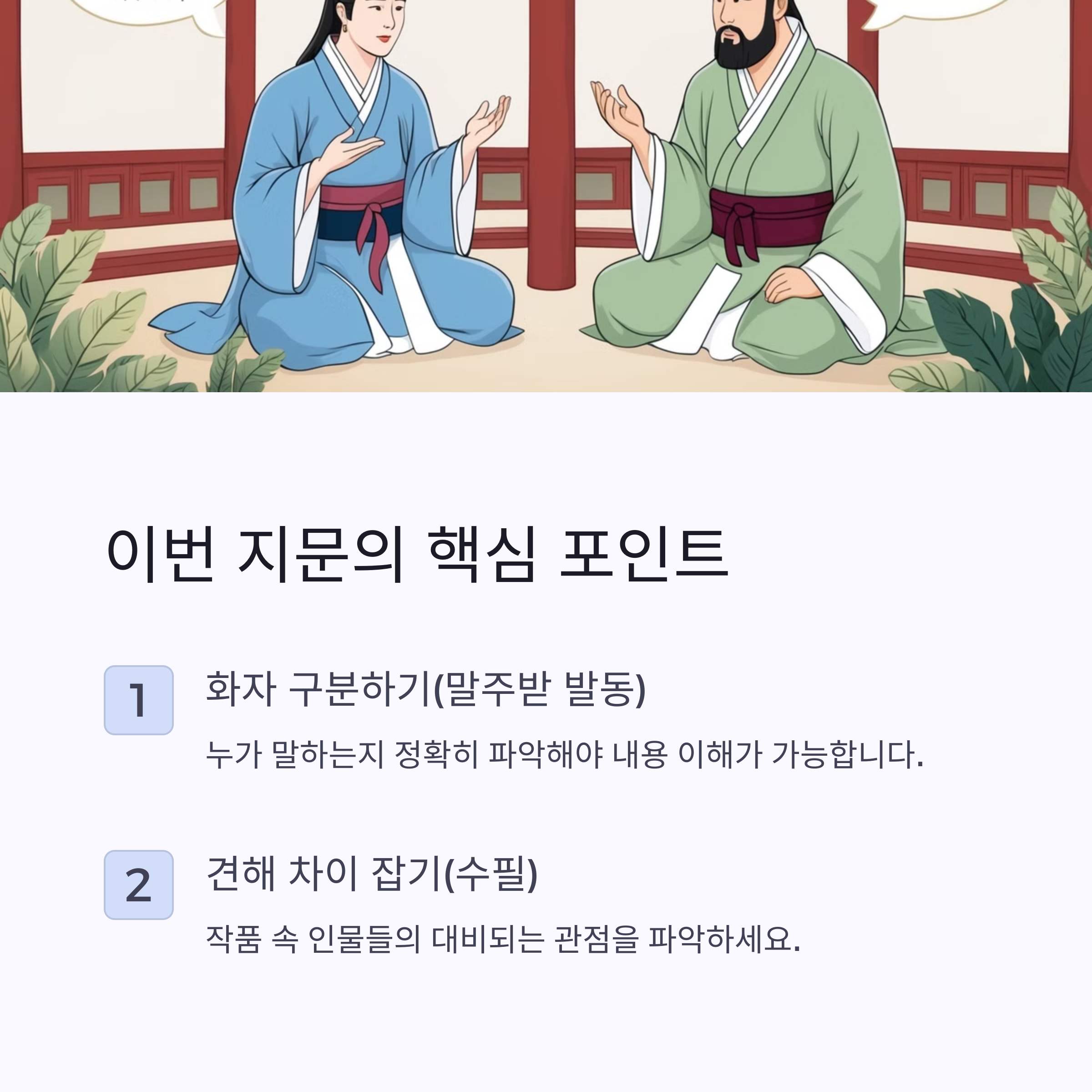 시험 시간이 부족하다고 느껴진다면, 갈래복합 지문을 읽을 때 대화 표지("~하는 말이", "~말하기를" 등)에 형광펜을 미리 칠해두는 것도 좋은 방법입니다. 그리고 수필을 읽을 때는 항상 '차이점'을 찾는다는 마음가짐으로 접근해보세요.