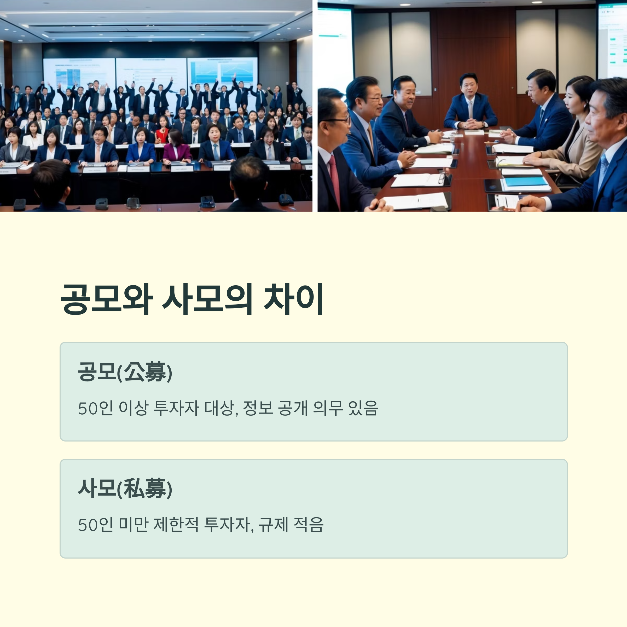 | 공모와 사모 | 공모(公募): 50인 이상의 투자자에게 증권 취득을 권유하는 방식으로, 정보 공개 의무가 있습니다. 사모(私募): 50인 미만의 제한된 투자자에게만 증권 취득을 권유하는 방식으로, 상대적으로 규제가 적습니다. |