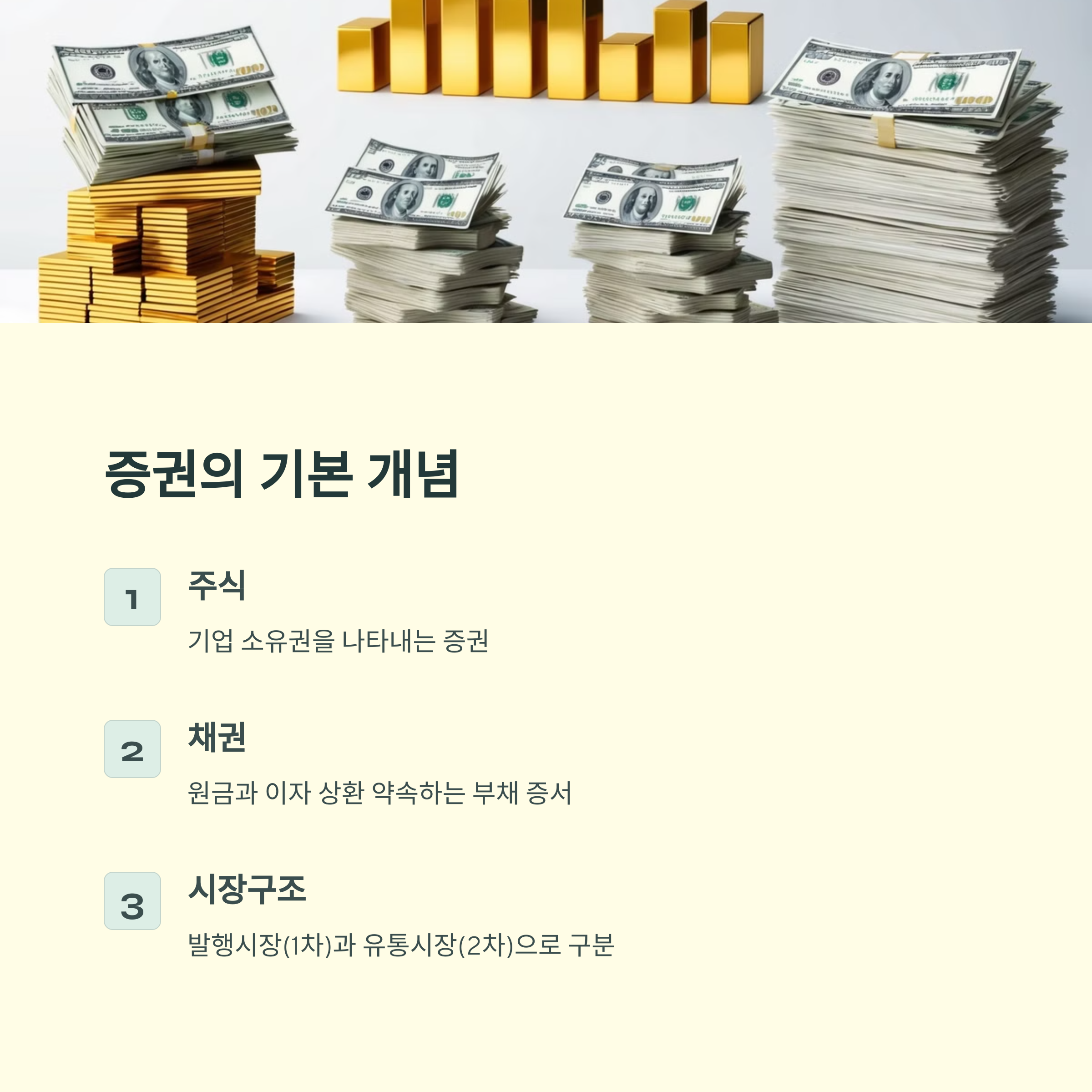 | 증권 시장의 구조 | 발행 시장(1차 시장): 기업이 증권을 처음 발행하여 투자자에게 판매하는 시장입니다. 유통 시장(2차 시장): 이미 발행된 증권이 투자자들 사이에서 거래되는 시장으로, 증권거래소가 대표적입니다. |