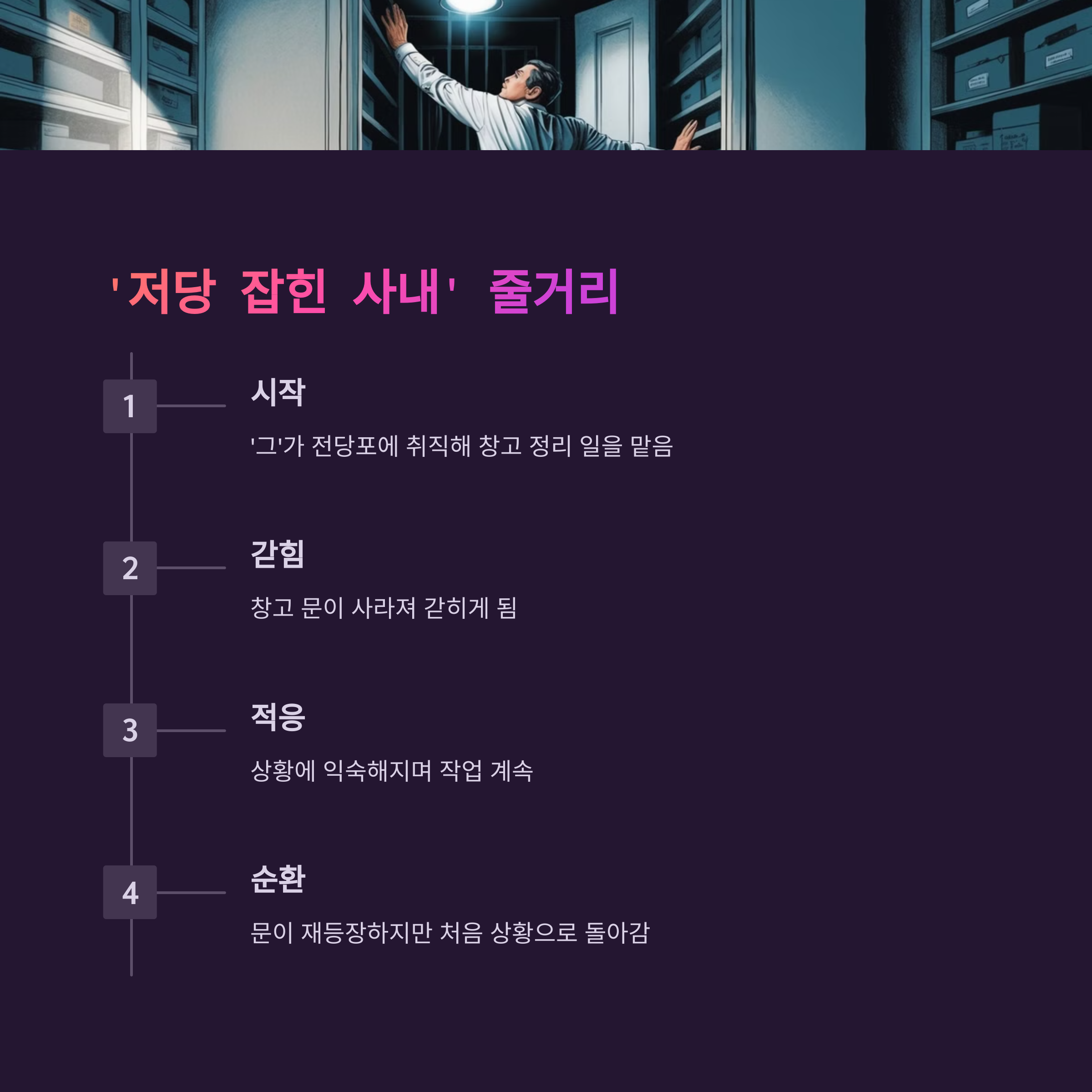 적응: 처음엔 당황했지만, '그'는 점점 이 상황에 익숙해져요. "어차피 내 인생은 계속 일만 하는 삶이었으니까..." 생각하며 창고 정리 작업을 계속합니다.