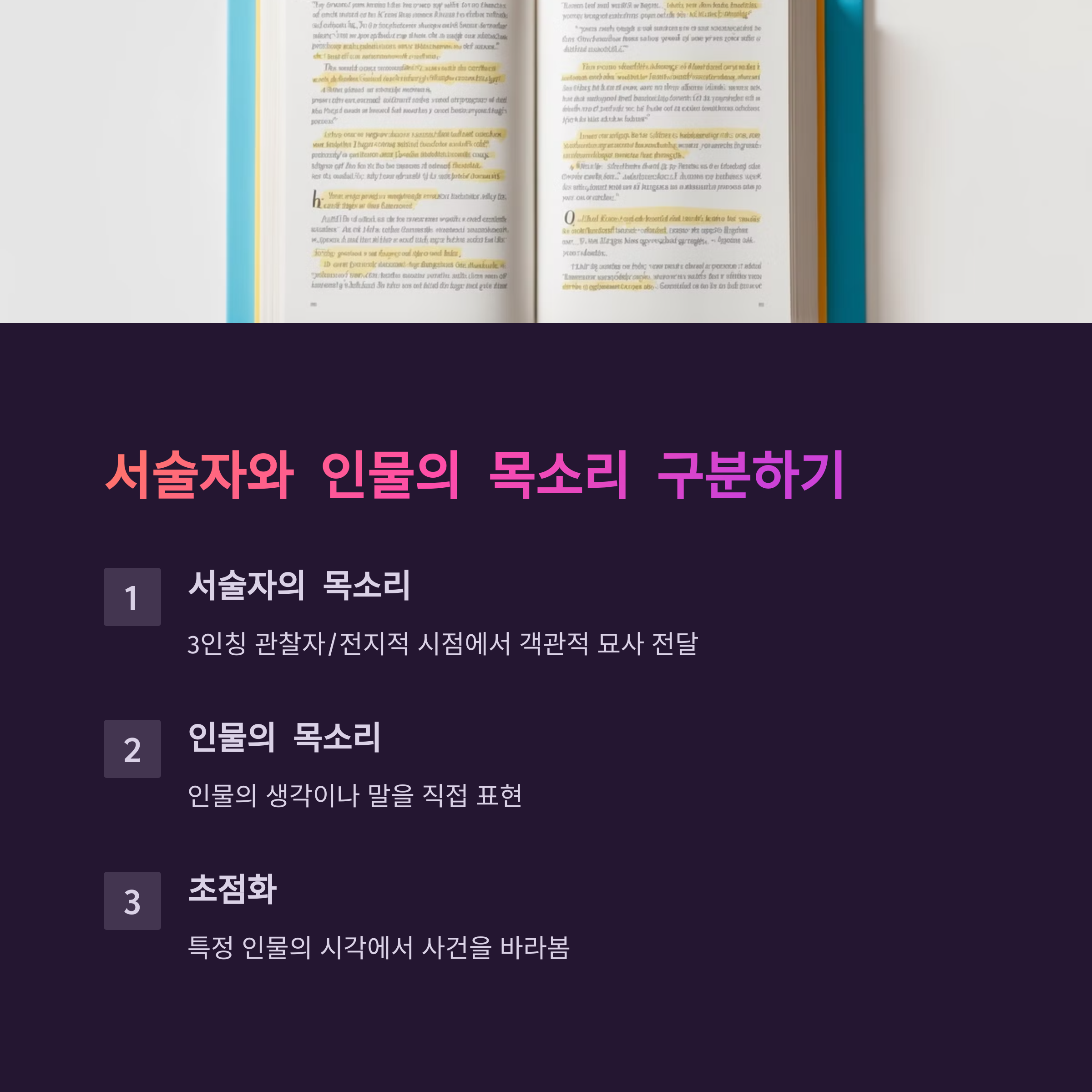 서술 방식 구별하기: 서술자가 말하는지, 인물이 말하는지, 아니면 둘이 섞여 있는지 반드시 구분하세요. 특히 '나', '자기', '자신'이라는 단어가 갑자기 등장하면 인물의 내면 목소리일 가능성이 높습니다. 문맥을 잘 살펴 누구의 관점인지 파악하는 연습을 하세요.