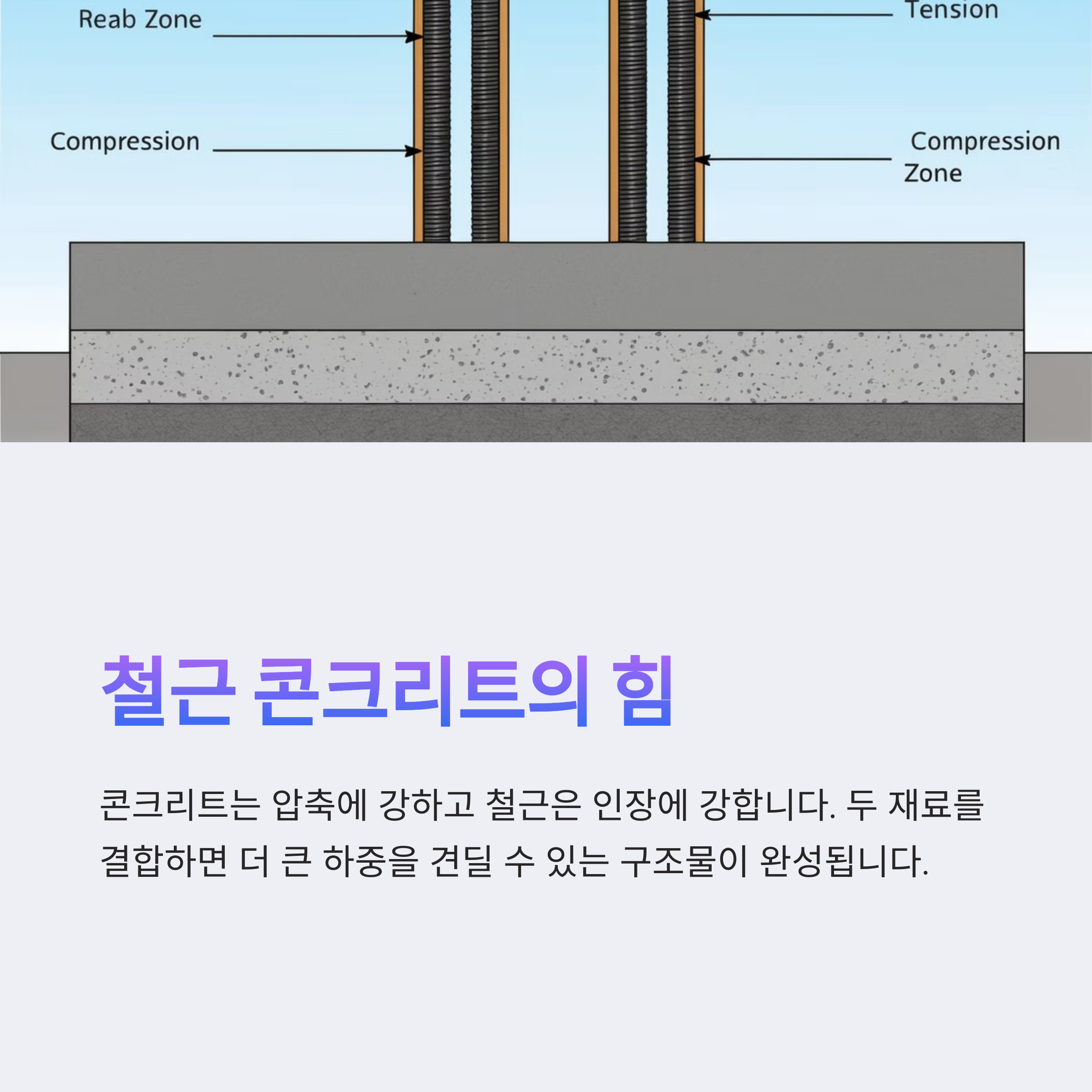 그래서 압축력을 주로 받는 구조에는 콘크리트만으로도 충분하지만, 인장력이 함께 작용하는 구조에서는 보완이 필요하답니다.