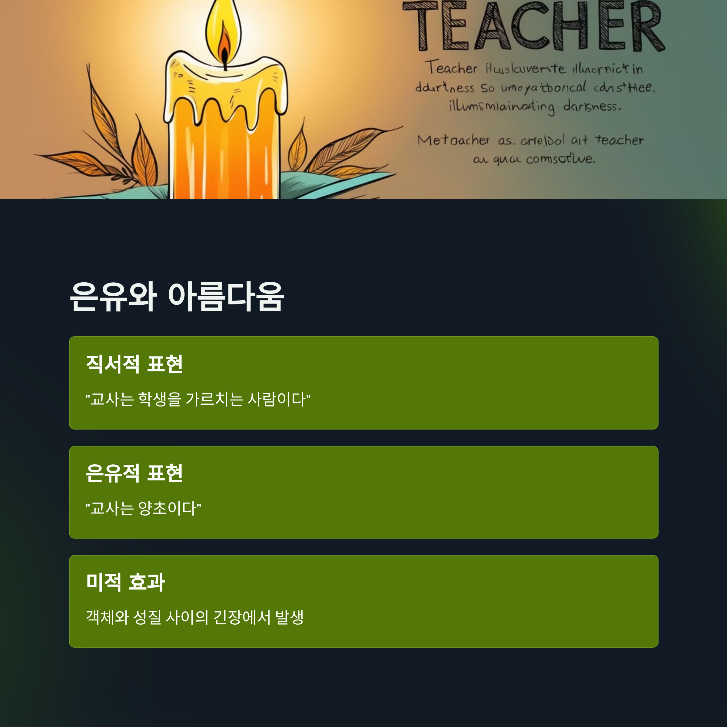 | 은유적 표현 | 교사는 양초이다 → 교사와 양초 사이의 비유적 연결. 의미를 유추하려는 노력 속에서 아름다움 발생. |