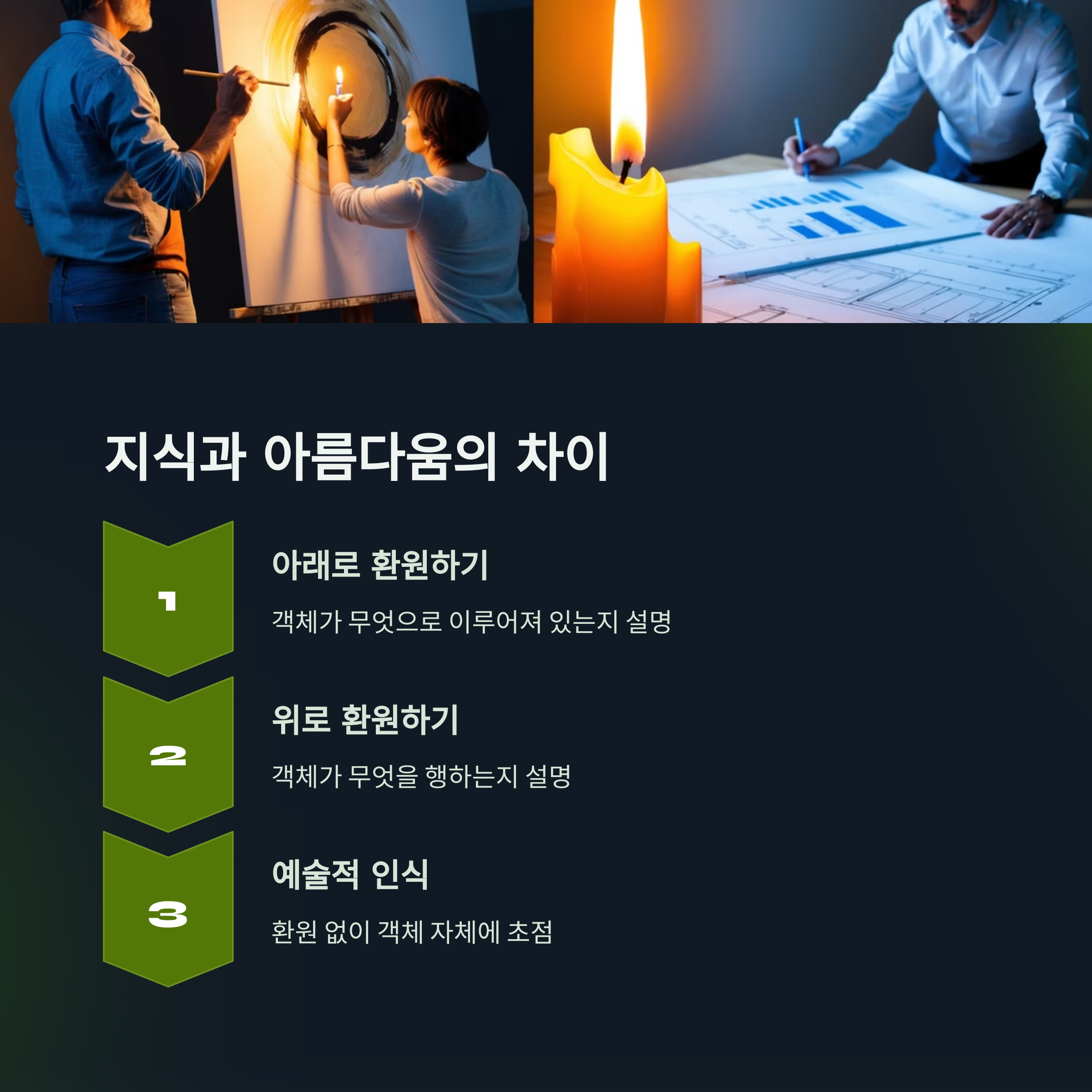 지식은 객체를 구성 성분(아래로 환원), 기능(위로 환원), 둘 다(이중 환원)로 설명하지만, 아름다움은 이 모든 설명을 넘어서야 한다고 봤어요.