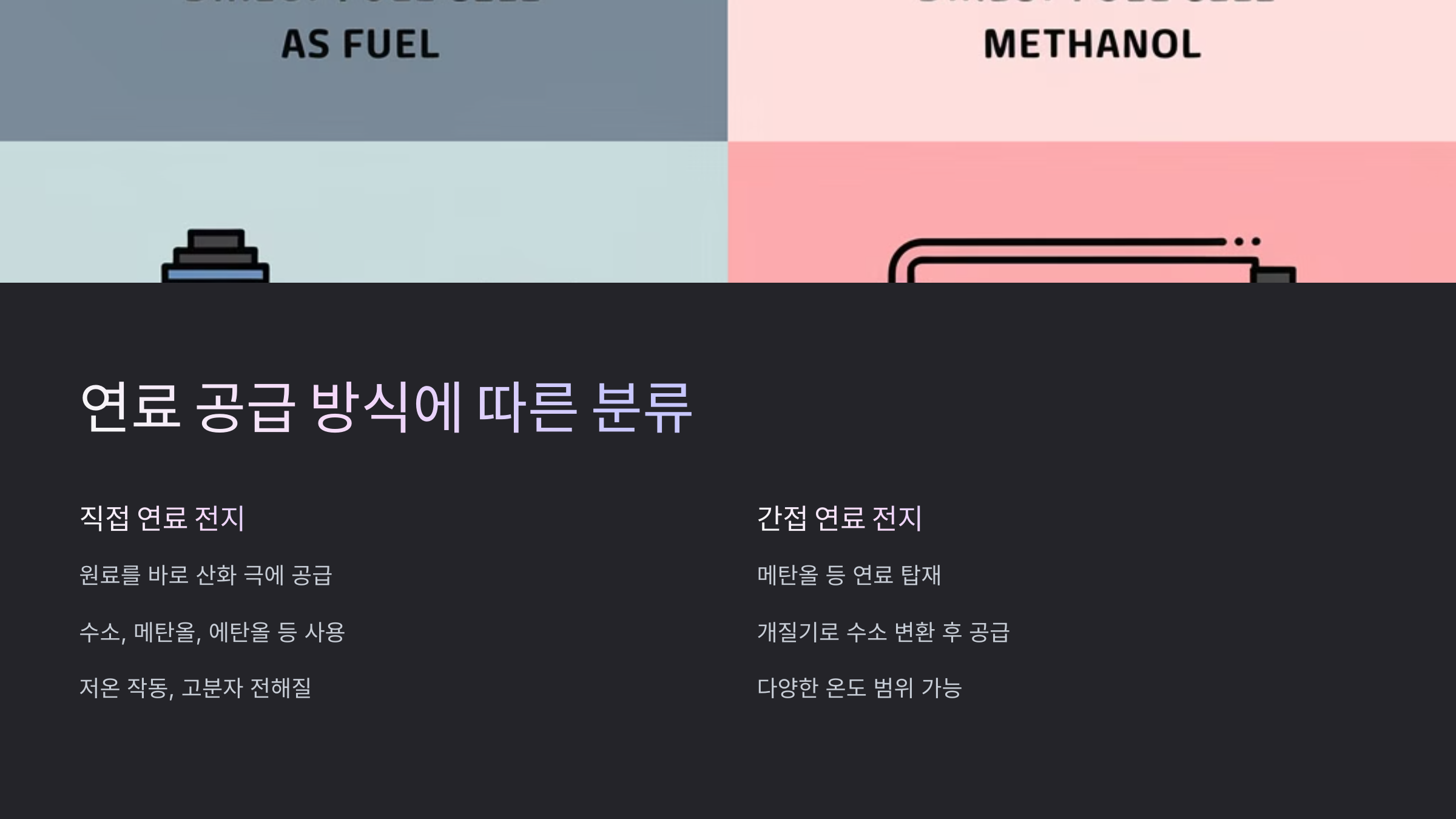 1. 직접 연료 전지: 탑재한 원료(수소, 메탄올, 에탄올 등)를 바로 산화 극에 공급
